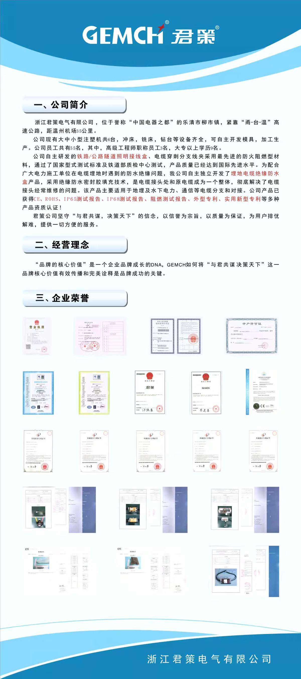 江西君策电气有限公司暨浙江君策电气有限公司,位于誉称“中国电器之都”的乐清市柳市镇,紧靠“甬-台-温”高速公路,距温州机场35公里。公司现有大中小型注塑机共6台,冲床,铣床,钻台等设备齐全,可自主开发模具,加工生产。公司员工共上百余人,其中,高级工程师职称员工3名,大专以上学历9名,现主营:灌胶防水接线盒、路灯配电盒EKM2035、安普型穿刺线夹、西卡姆型穿刺线夹、隧道专用电缆分线盒、高压穿刺线夹/接地线夹等多种产品。