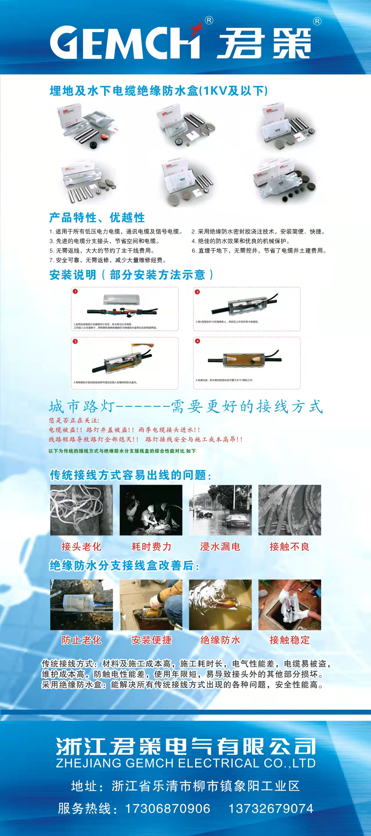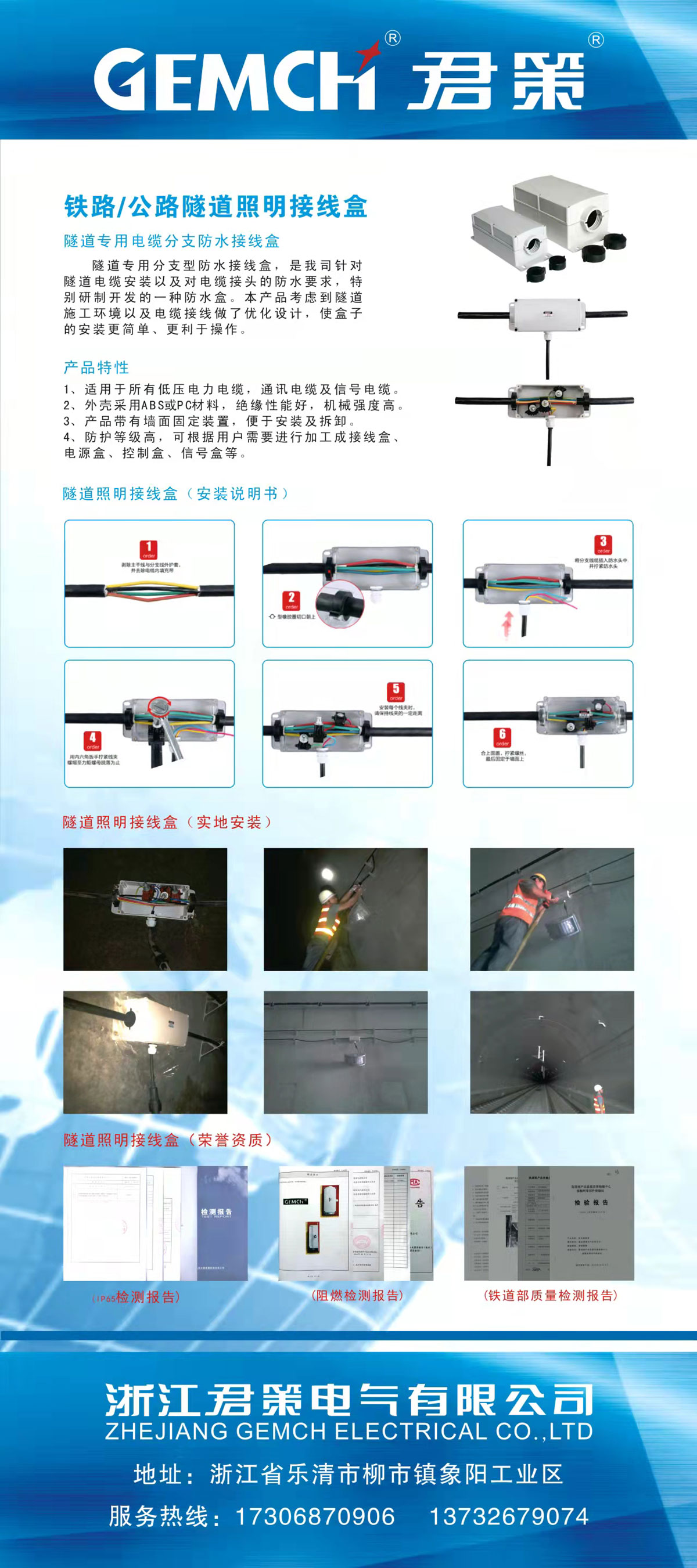 公司自主研发的铁路/公路隧道照明接线盒、电缆穿刺分支线夹采用防火阻燃型材料,通过了国家型式测试标准及铁道部质检中心测试,产品质量可靠有保障。为配合广大电力施工单位在电缆埋地时遇到的防水绝缘问题,我公司自主独立开发了埋地电缆绝缘防水盒产品,采用绝缘防水密封胶填充技术,是电缆接头处和原电缆成为一个整体,彻底解决了电缆接头经常维修的问题。该产品主要适用于地埋及水下电力、通信等电缆分支和对接。公司产品已获得CE、ROHS、IP65测试报告、IP68测试报告、阻燃测试报告、外型专利、实用新型专利等多种产品资质认证!