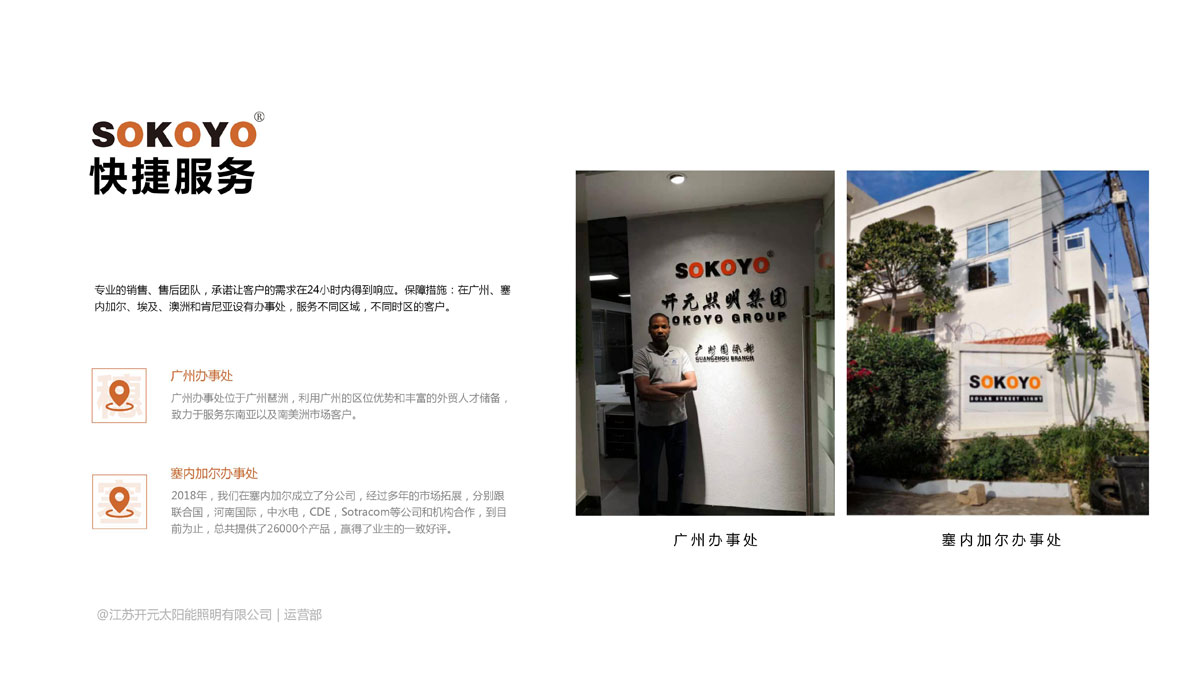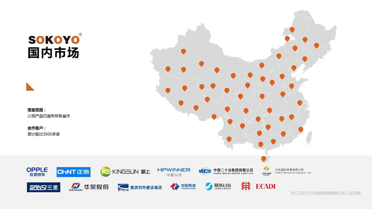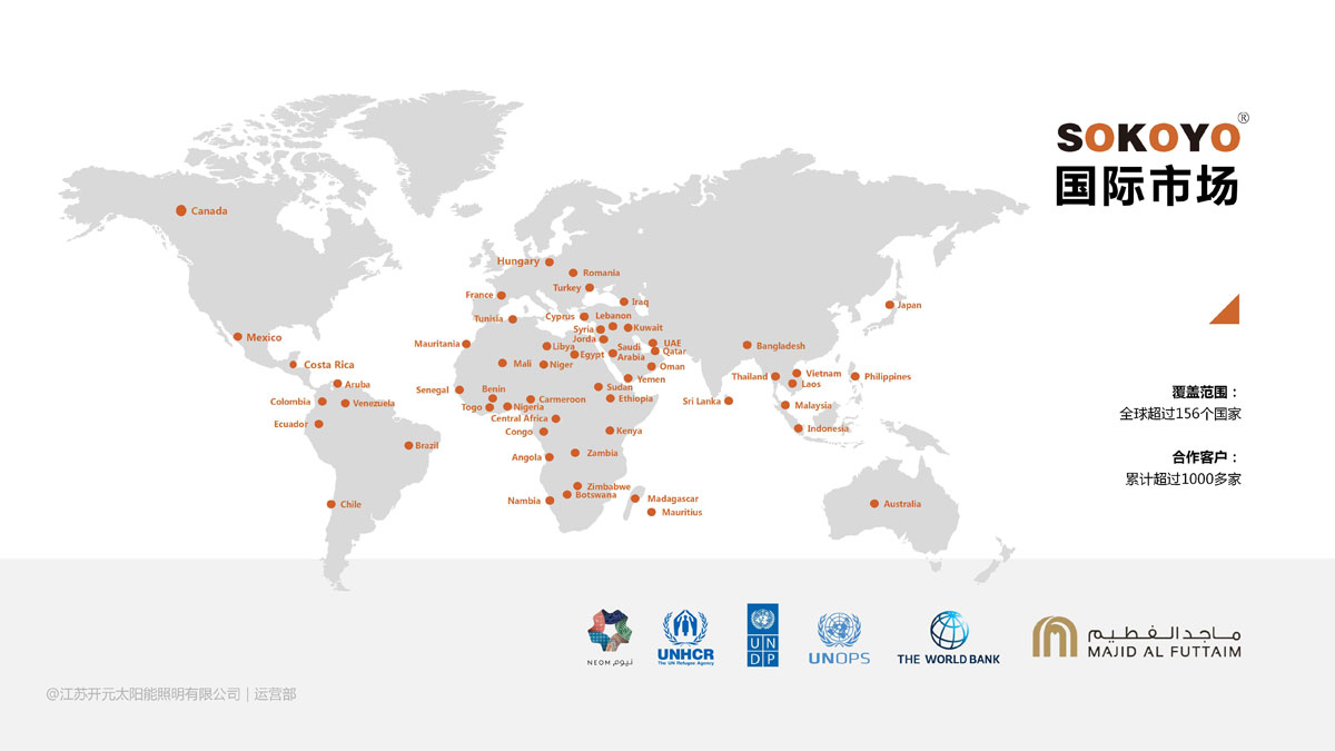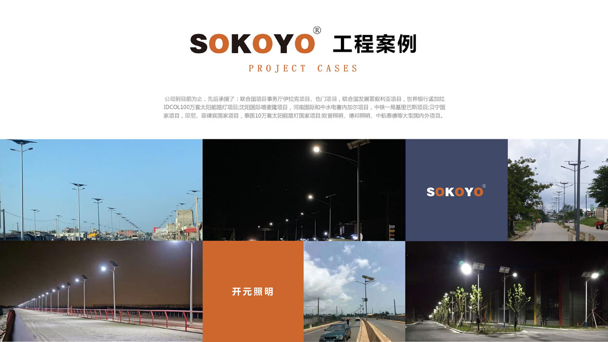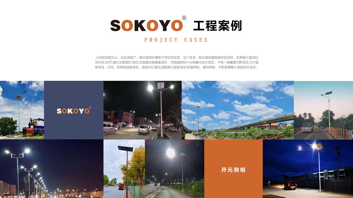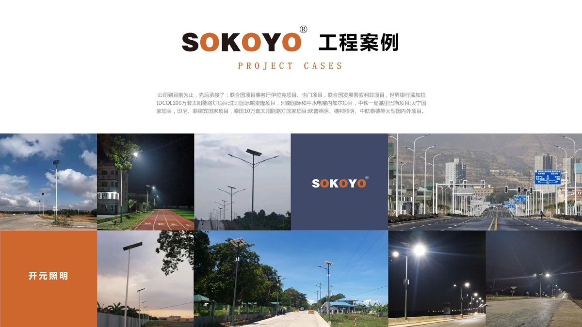 典型项目:联合国项目事务厅伊拉克项目、也门项目,联合国发展署叙利亚项目,世界银行孟加拉IDCOL100万套太阳能路灯项目;沈阳国际喀麦隆项目,河南国际和中水电塞内加尔项目,中铁一局基里巴斯项目;贝宁国家项目,印尼、菲律宾国家项目,泰国10万套太阳能路灯国家项目;欧普照明、德邦照明、中航泰德等国内外项目。
