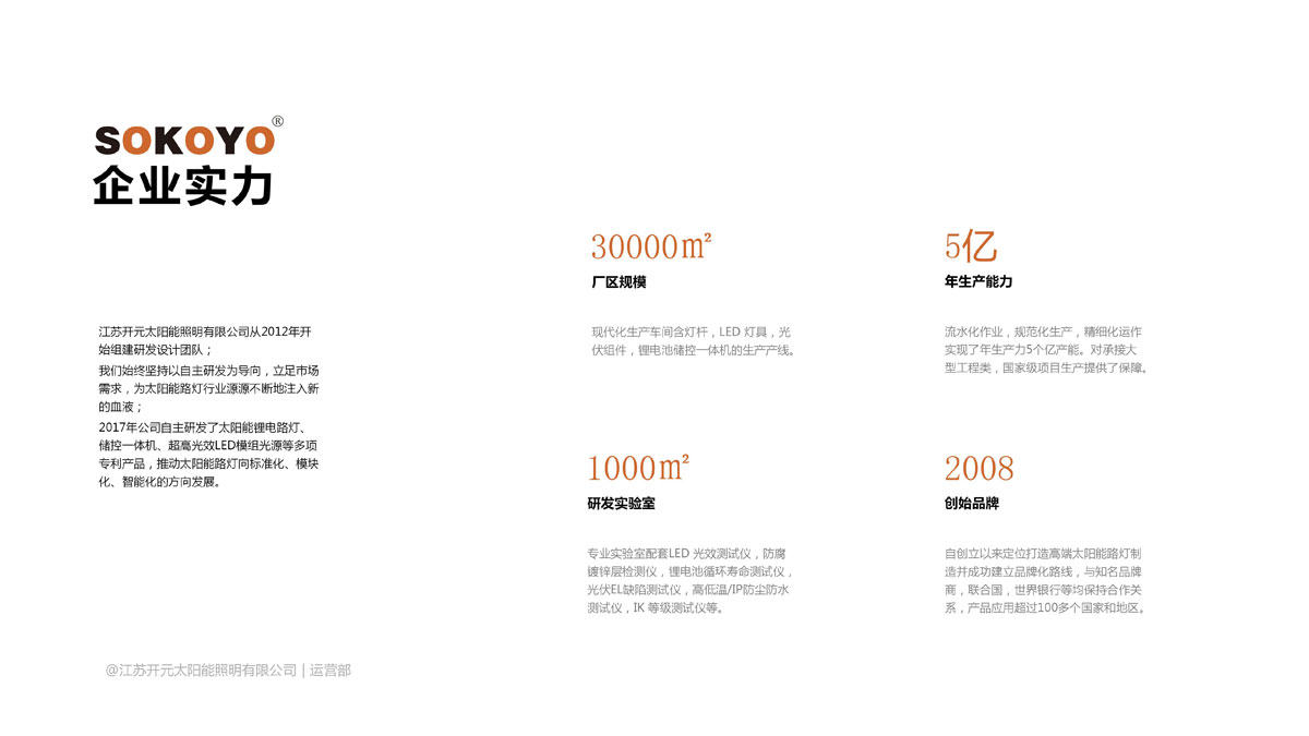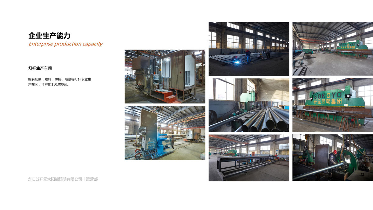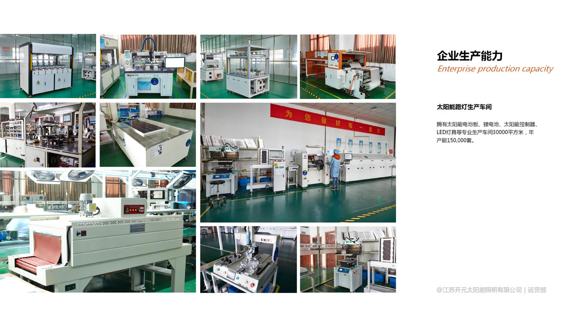 生产能力:拥有太阳能电池板、锂电池、太阳能控制器、LED灯具、灯杆等专业生产车间80000平方米,以及满足年销售5亿元的各类生产设备200多台。