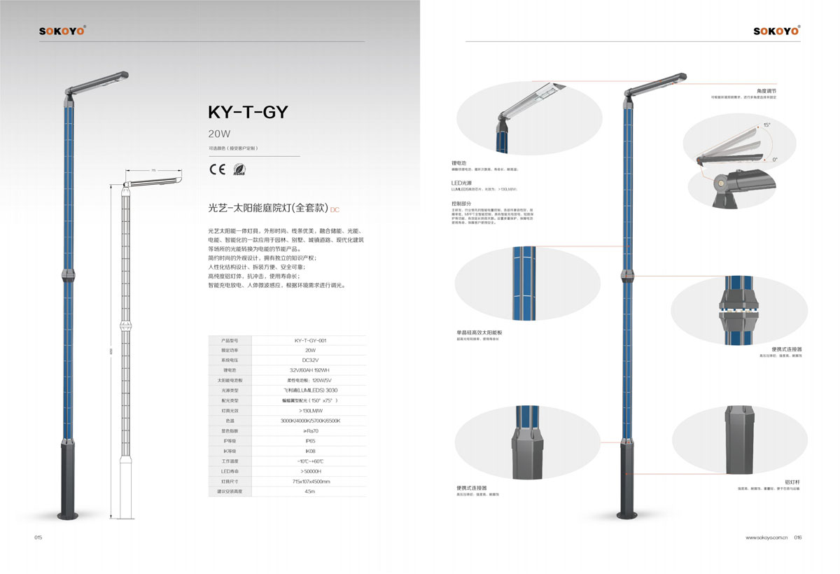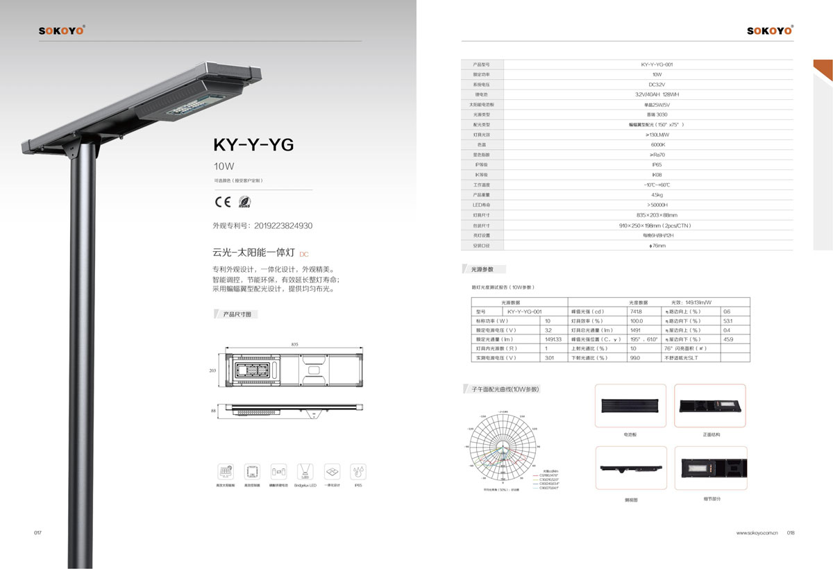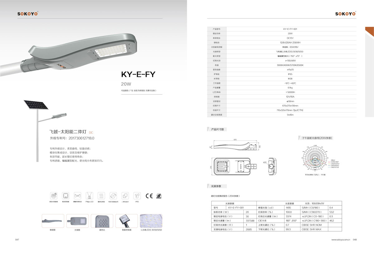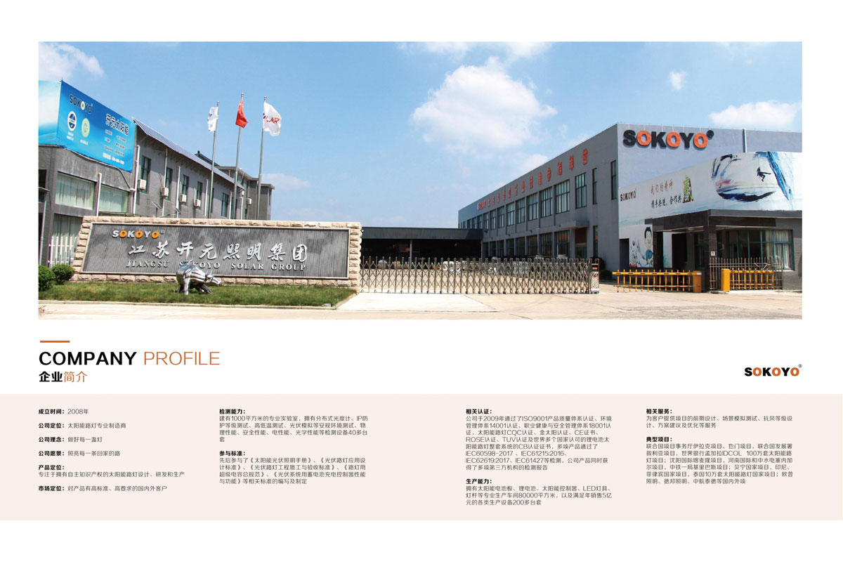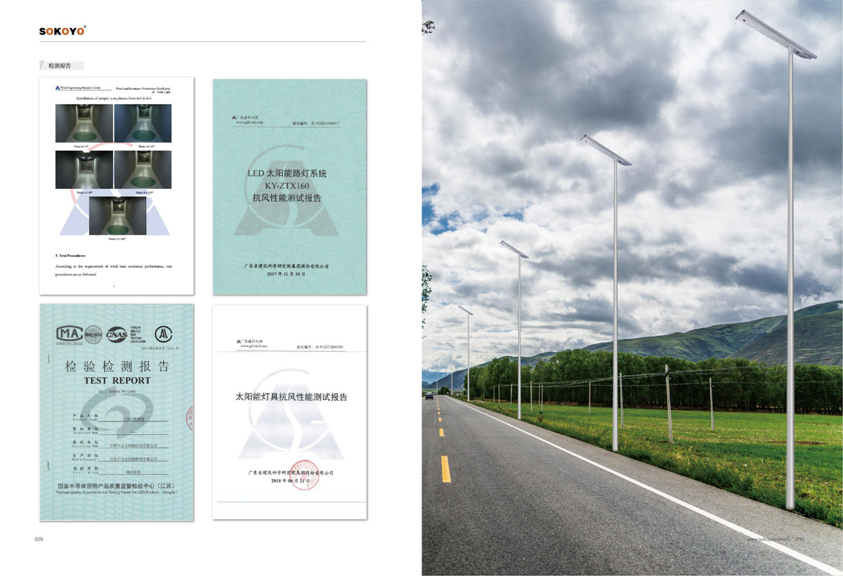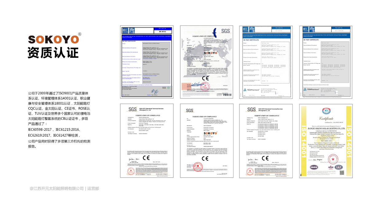 相关认证:太阳能路灯CQC认证、金太阳认证、CE证书、ROSH认证、TUV认证、世界多个国家认可的锂电池太阳能路灯整套系统的CB认证证书、多项产品通过了IEC60598-2017;IEC61215:2016;IEC62619:2017;IEC61427等检测;公司产品同时获得了多项第三方机构的检测报告。
