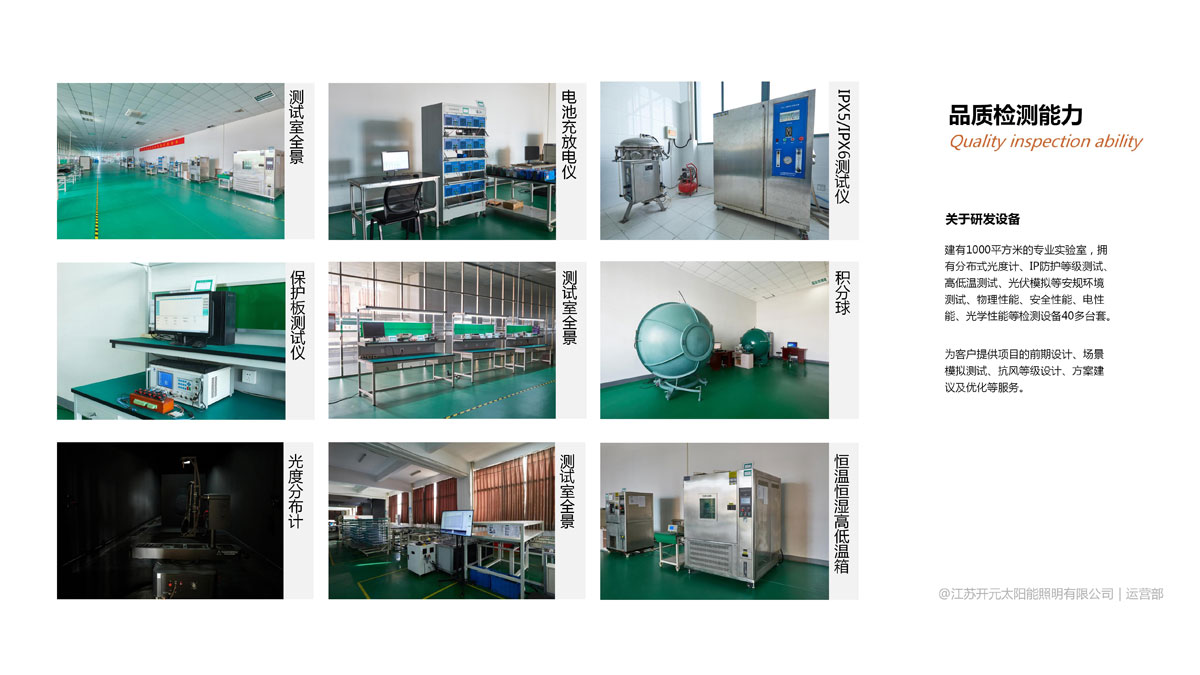 检测能力:建有1000平方米的专业实验室,拥有分布式光度计、IP防护等级测试、高低温测试、光伏模拟等安规环境测试、物理性能、安全性能、电性能、光学性能等检测设备40多台。