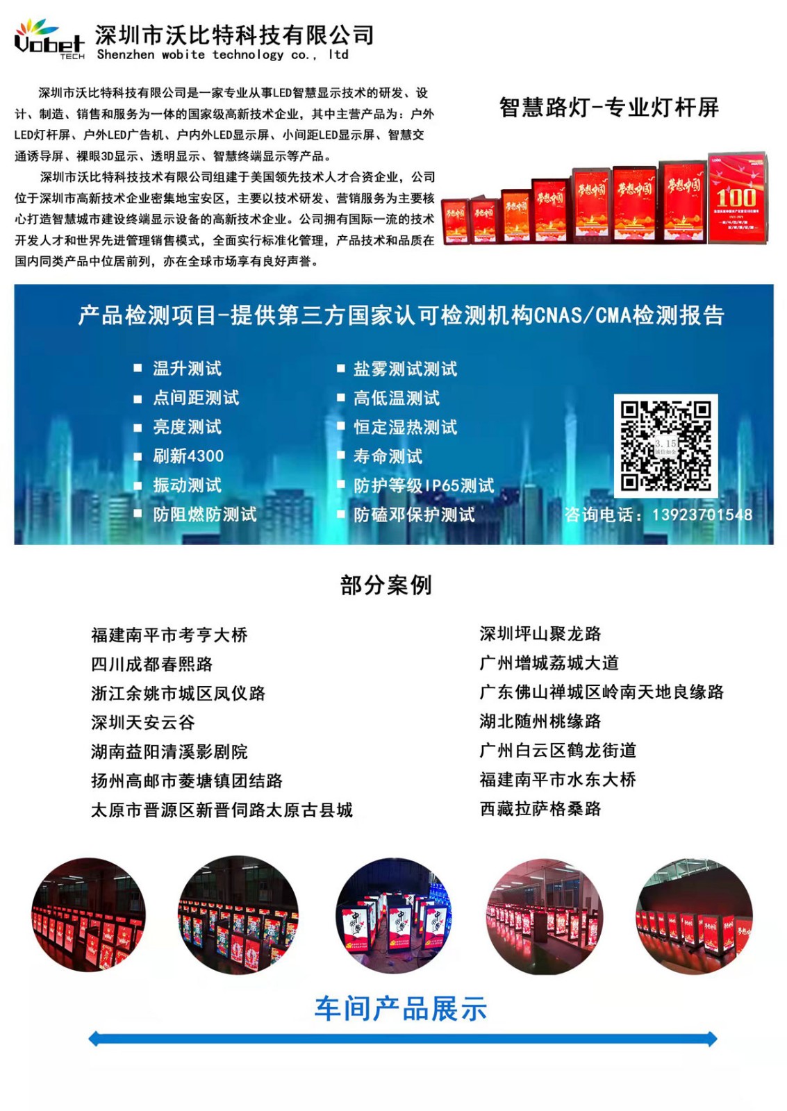 深圳市沃比特科技有限公司是一家专业从事LED智慧显示技术的研发、设计、制造、销售和服务为一体的国家级高新技术企业,其中主营产品为:户外LED灯杆屏、户外LED广告机、户内外LED显示屏、小间距LED显示屏、智慧交通诱导屏、裸眼3D显示、透明显示、智慧终端显示等产品。