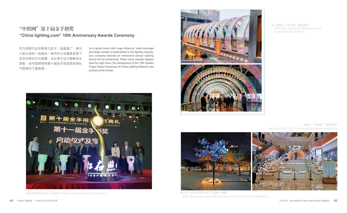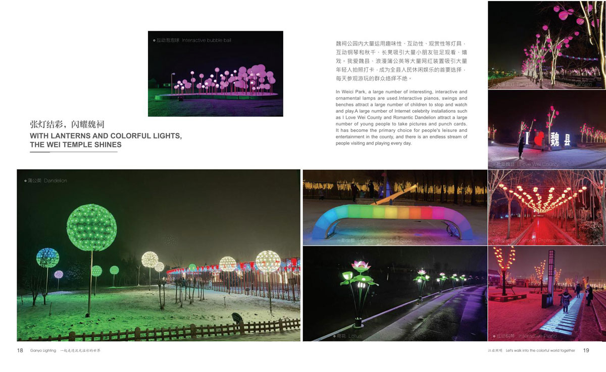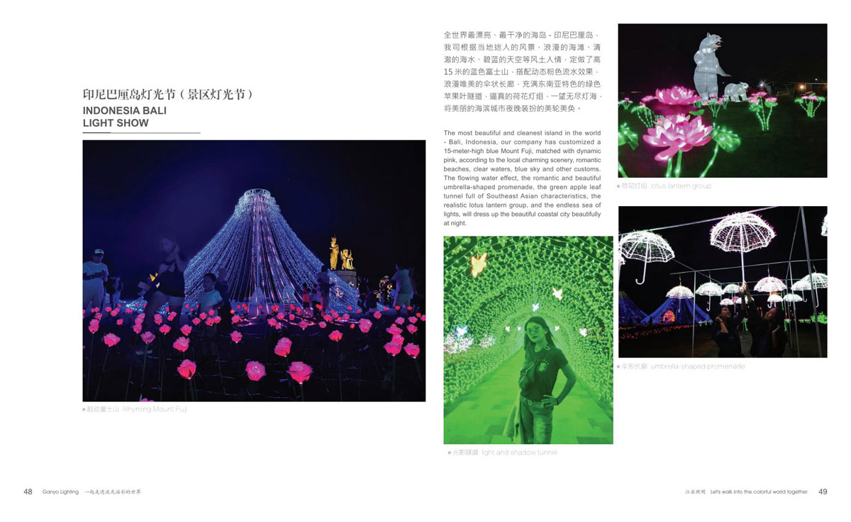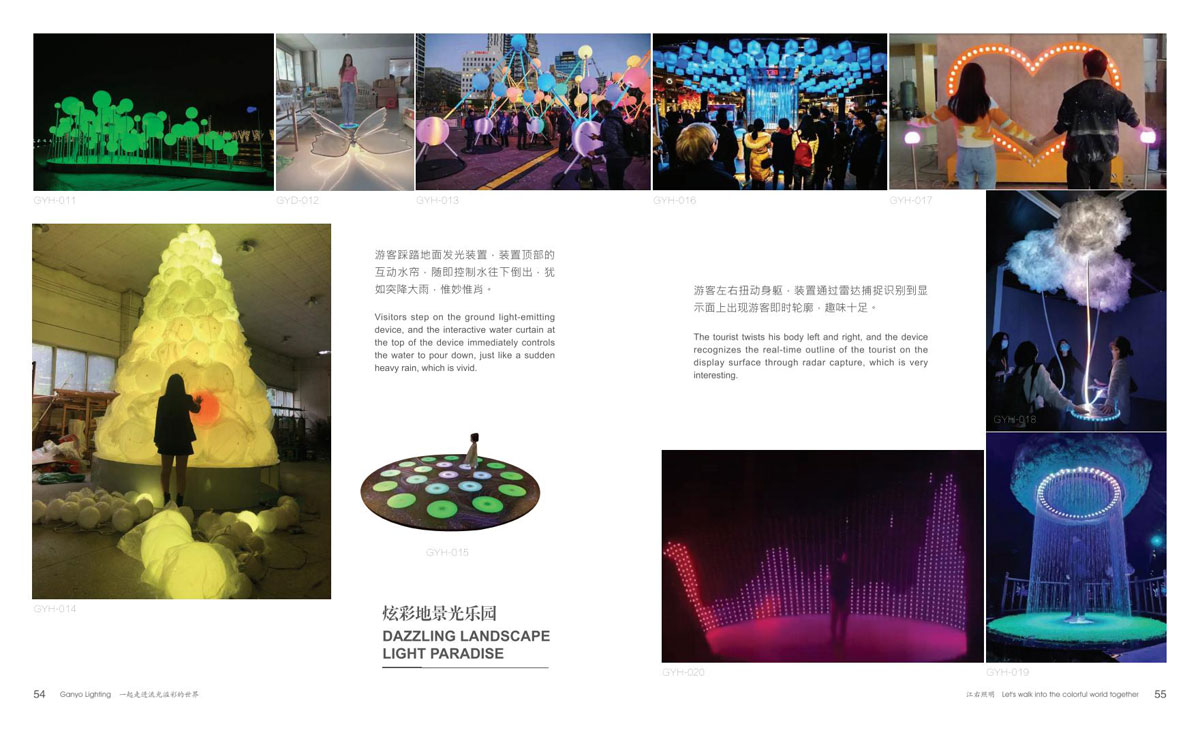 同时和国内众多设计院、设计公司保持紧密的合作,依托了强大的研发设计团队。江右一直致力于文旅产品,在全彩、互动式、手机联动等方面的推陈出新,运用大量投影、激光、雾森、显示屏、音响等表现形式到非标定制产品中,实现真正的声光电整体联动。产品涵盖节日装饰灯和互动非标定制文旅灯两大板块,公司销售网络遍布全国,产品远销欧美、东南亚、中东、南美洲等国家和地区。