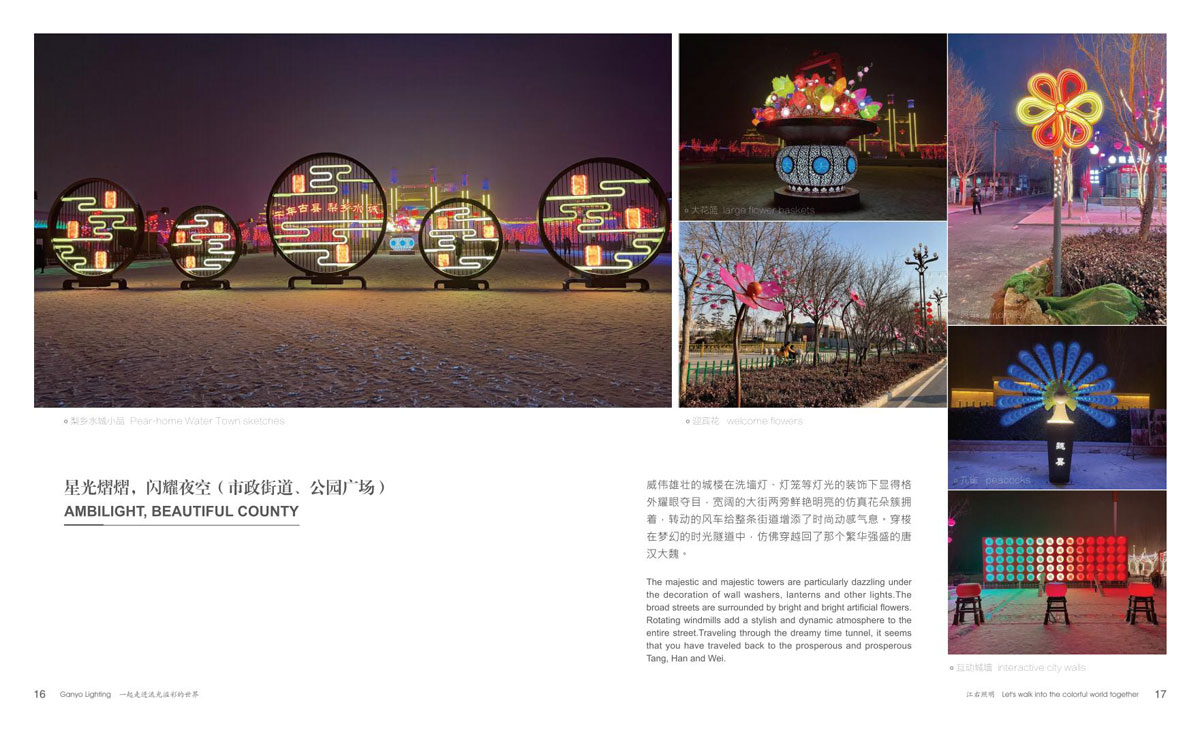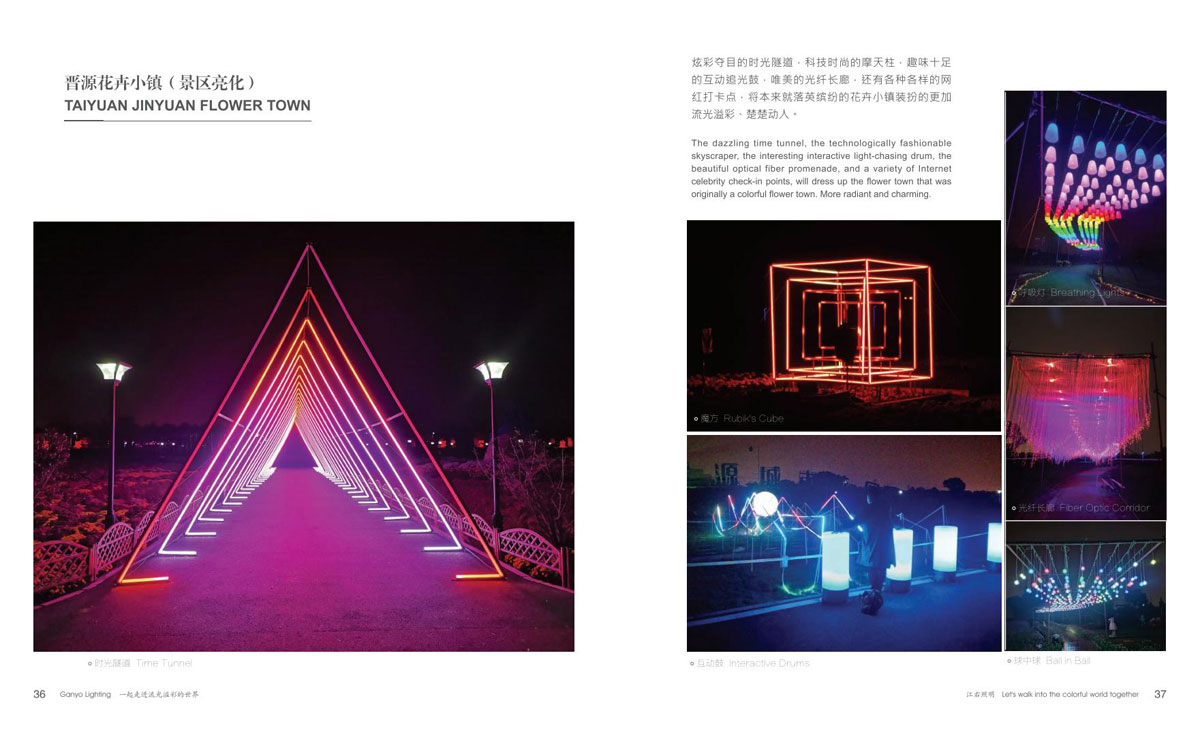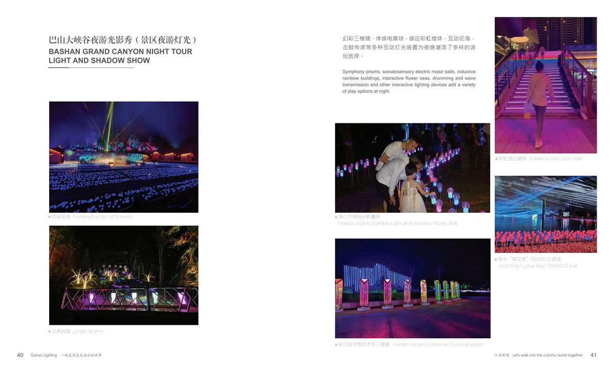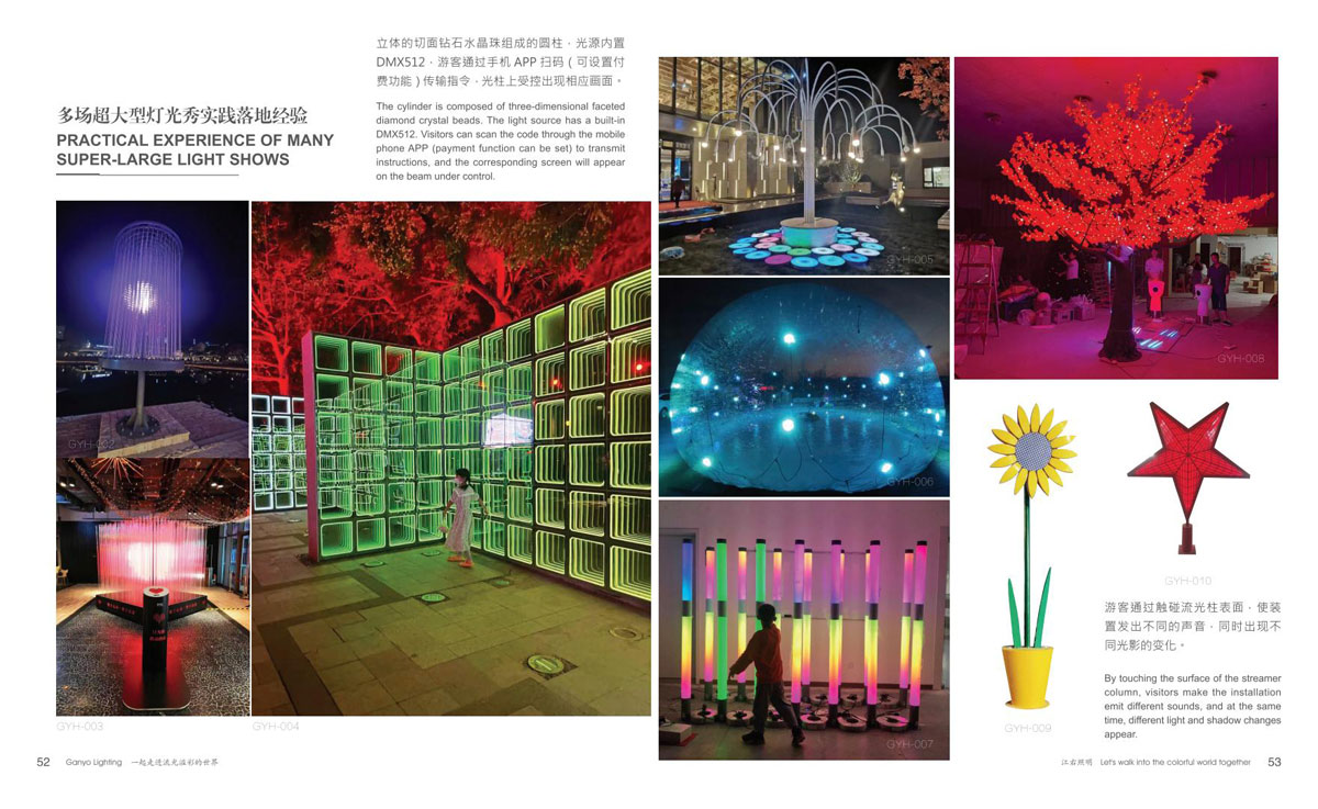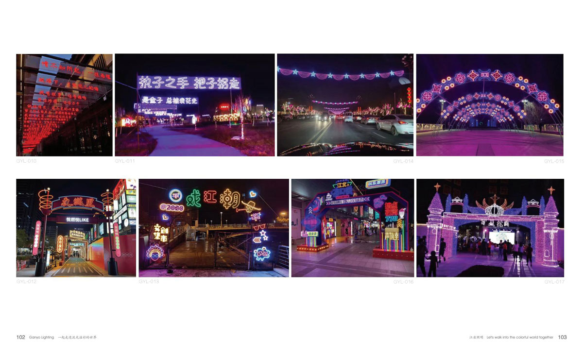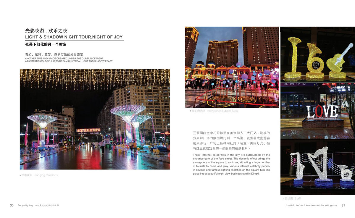本公司为客户提供优质产品和项目前期现场勘察、效果图、汇报方案制作、施工图电气图、项日整体施工等整套专业配套服务,成为客户值得信赖的伙伴。项目主要涉及市政街道亮化、文旅夜游、景区灯光节亮化、商场美陈亮化、地产售楼部亮化、酒店、会所、KTV亮化等,江右本着“合格的标准就是高于客户的期待值”为每-个客户提供最具性价比的产品和贴心细致、靠谱真诚的服务。