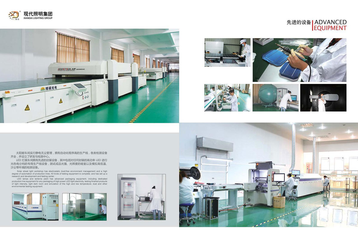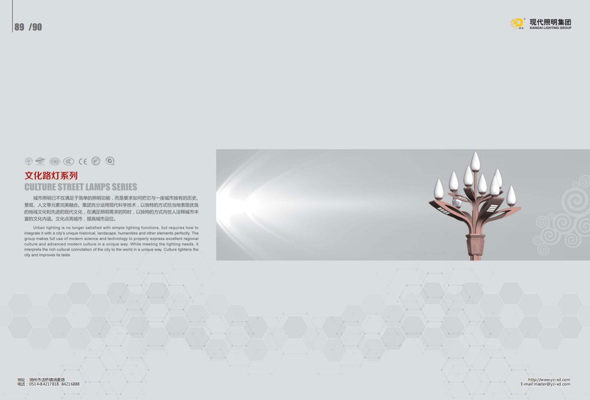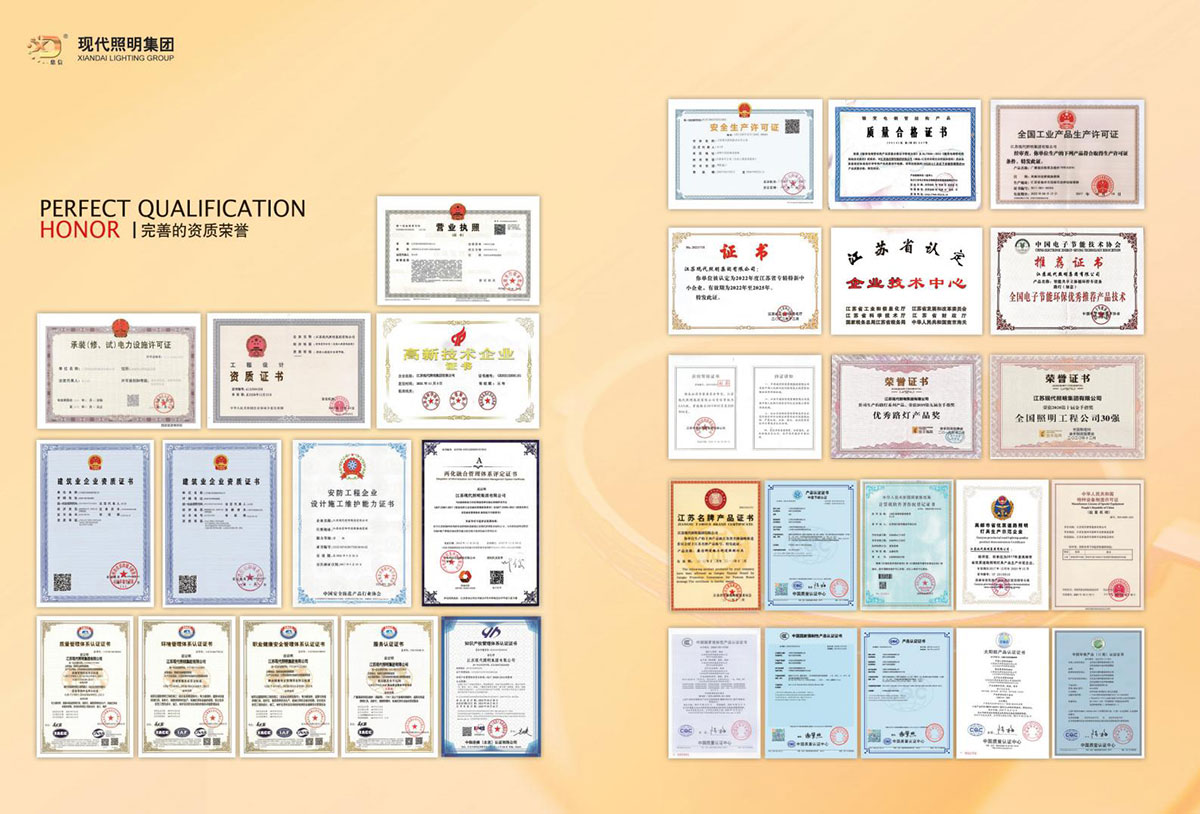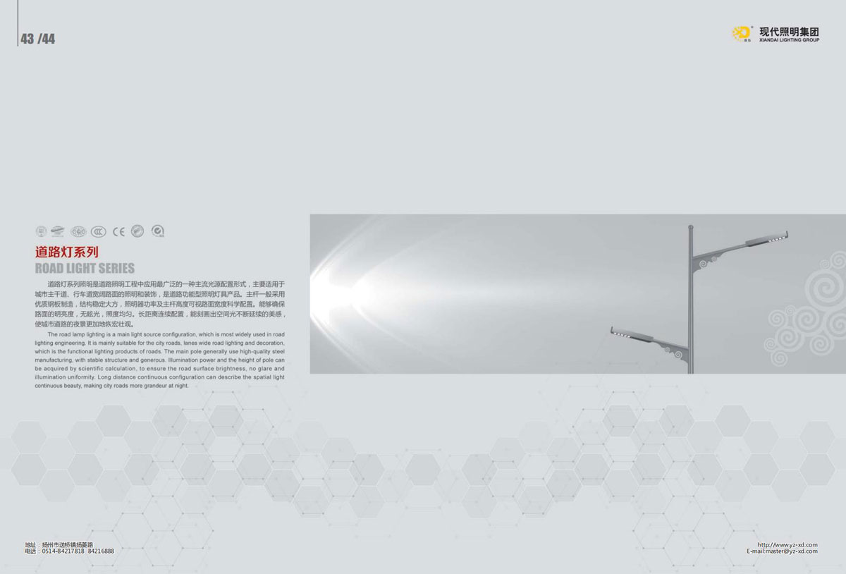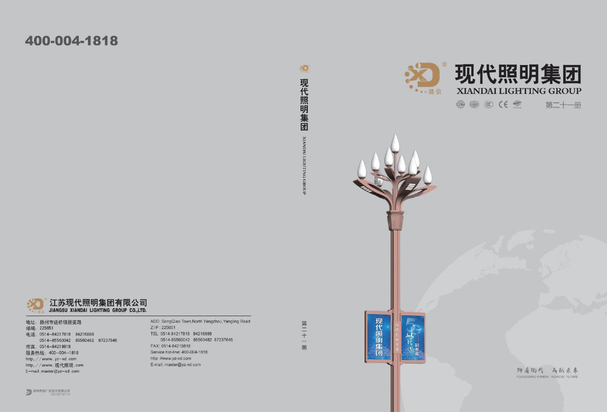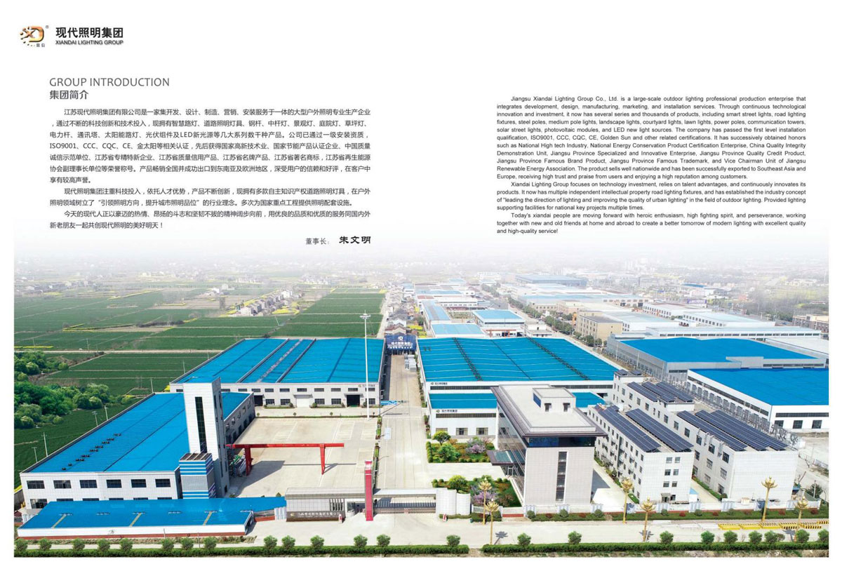 公司集户外照明产品研发、制造、营销、安装于一体,产品涉及道路照明灯具、灯杆、中高杆灯、景观灯、庭院灯、草坪灯、LED新光源、太阳能光伏组件、太阳能路灯、景观亮化、电力杆、通信塔等多个系列近千品种。公司连续多年被工商行政管理局评为“重合同、守信用企业”、连年被江苏省国际咨询评估公司评为“AAA”级资信企业、率先通过了ISO9001:2008国际质量体系认证,ISO:14001/18000国际环境体系认证,太阳能路灯产品获金太阳产品认证,并通过SGS、RASO、CE认证。获江苏省名牌产品、江苏省著名商标、江苏省可再生能源协会副理事单位、扬州路灯商会副理事单位。