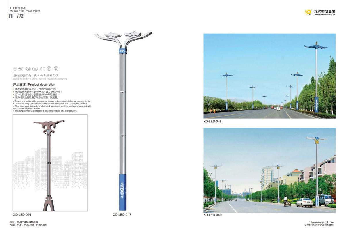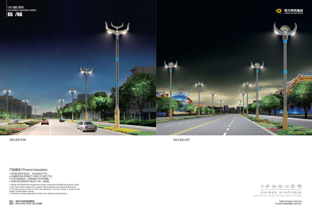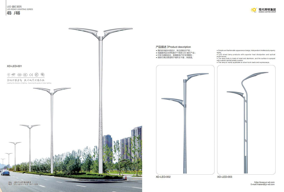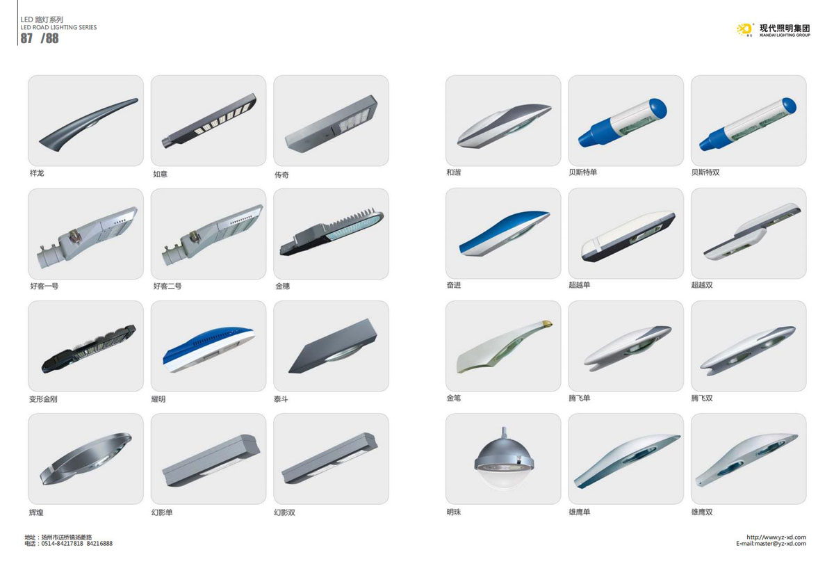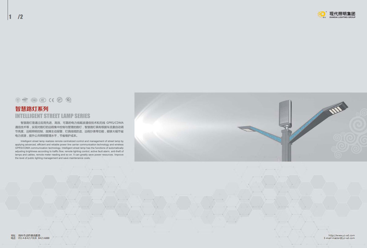 公司集户外照明产品研发、制造、营销、安装于一体,产品涉及道路照明灯具、灯杆、中高杆灯、景观灯、庭院灯、草坪灯、LED新光源、太阳能光伏组件、太阳能路灯、景观亮化、电力杆、通信塔等多个系列近千品种。公司连续多年被工商行政管理局评为“重合同、守信用企业”、连年被江苏省国际咨询评估公司评为“AAA”级资信企业、率先通过了ISO9001:2008国际质量体系认证,ISO:14001/18000国际环境体系认证,太阳能路灯产品获金太阳产品认证,并通过SGS、RASO、CE认证。获江苏省名牌产品、江苏省著名商标、江苏省可再生能源协会副理事单位、扬州路灯商会副理事单位。
