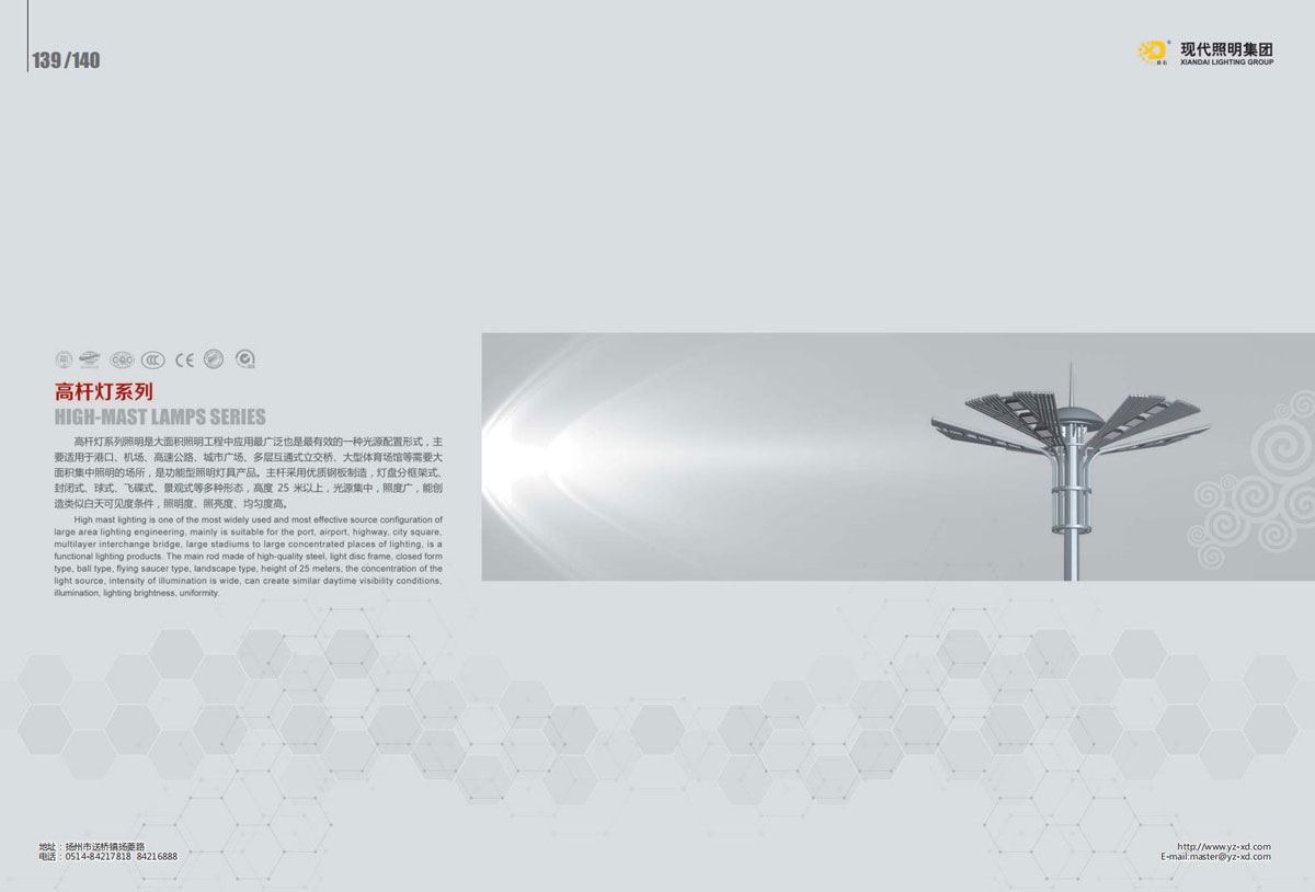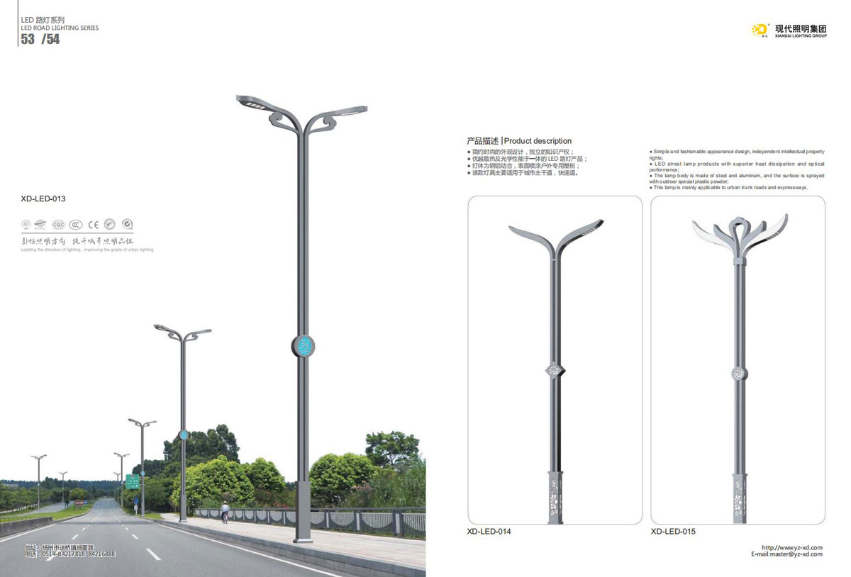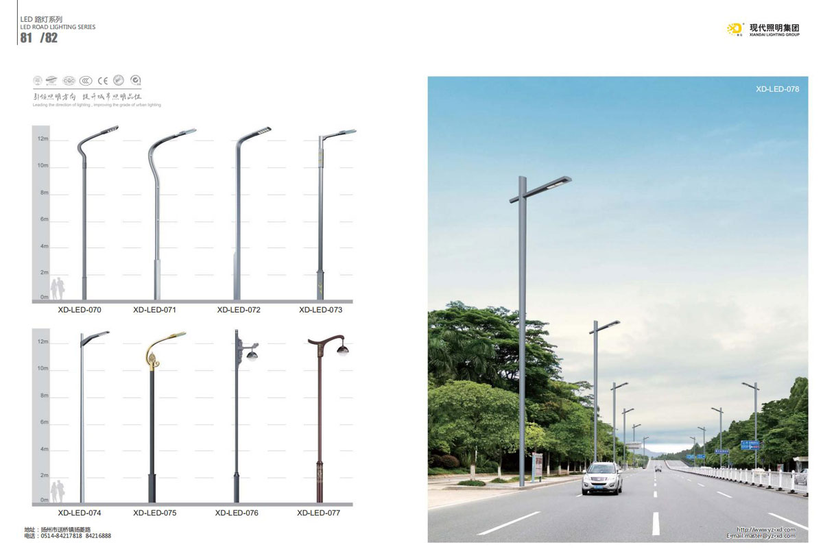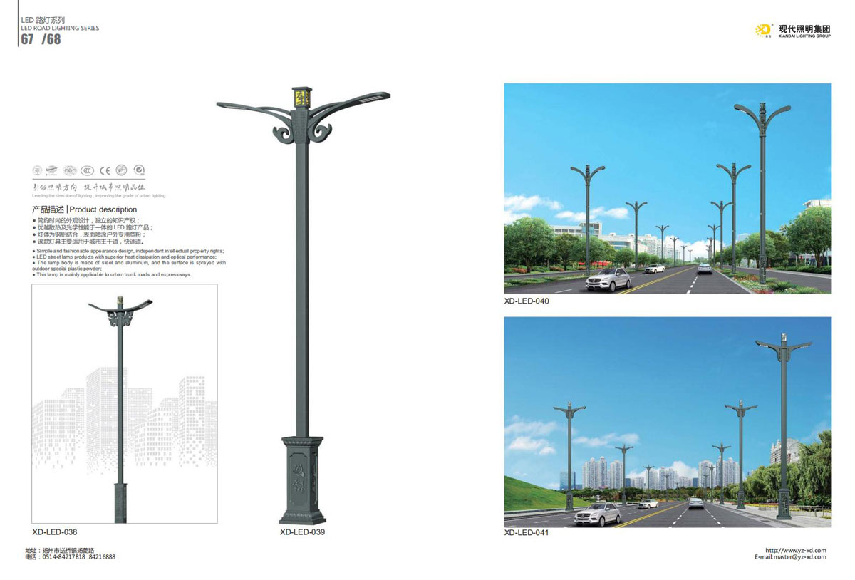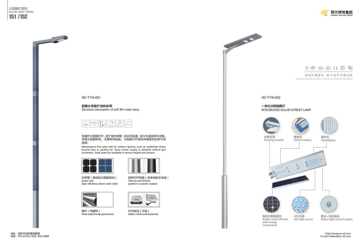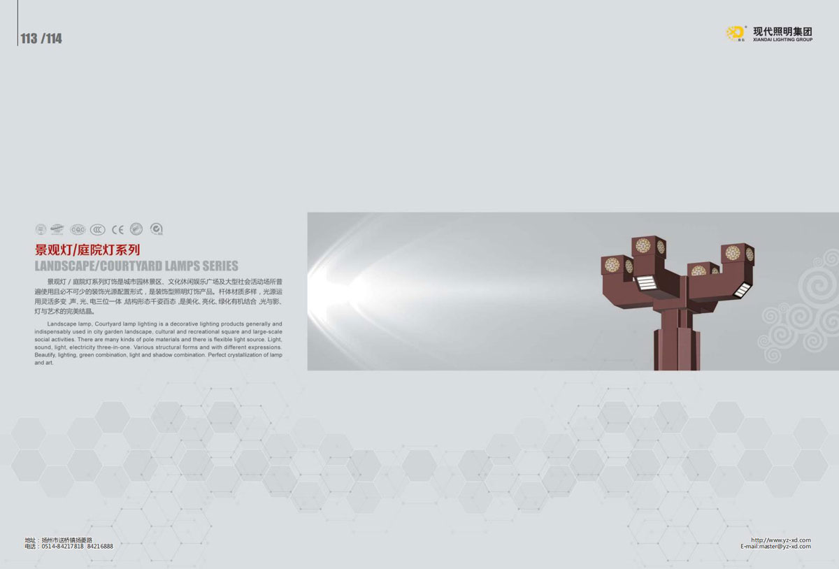 公司集户外照明产品研发、制造、营销、安装于一体,产品涉及道路照明灯具、灯杆、中高杆灯、景观灯、庭院灯、草坪灯、LED新光源、太阳能光伏组件、太阳能路灯、景观亮化、电力杆、通信塔等多个系列近千品种。公司连续多年被工商行政管理局评为“重合同、守信用企业”、连年被江苏省国际咨询评估公司评为“AAA”级资信企业、率先通过了ISO9001:2008国际质量体系认证,ISO:14001/18000国际环境体系认证,太阳能路灯产品获金太阳产品认证,并通过SGS、RASO、CE认证。获江苏省名牌产品、江苏省著名商标、江苏省可再生能源协会副理事单位、扬州路灯商会副理事单位。