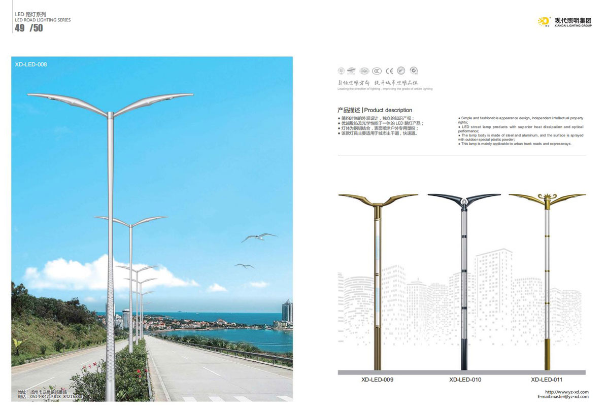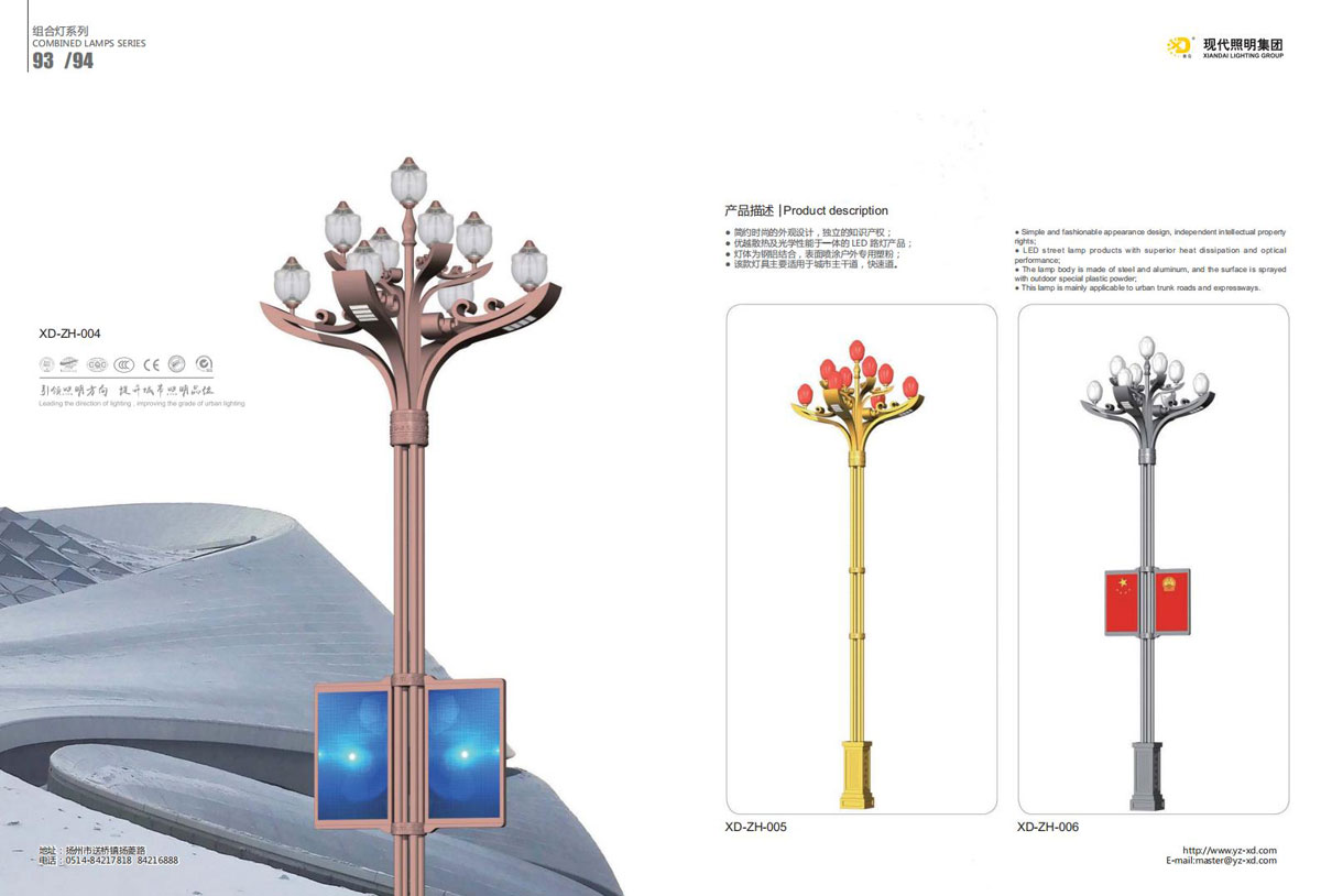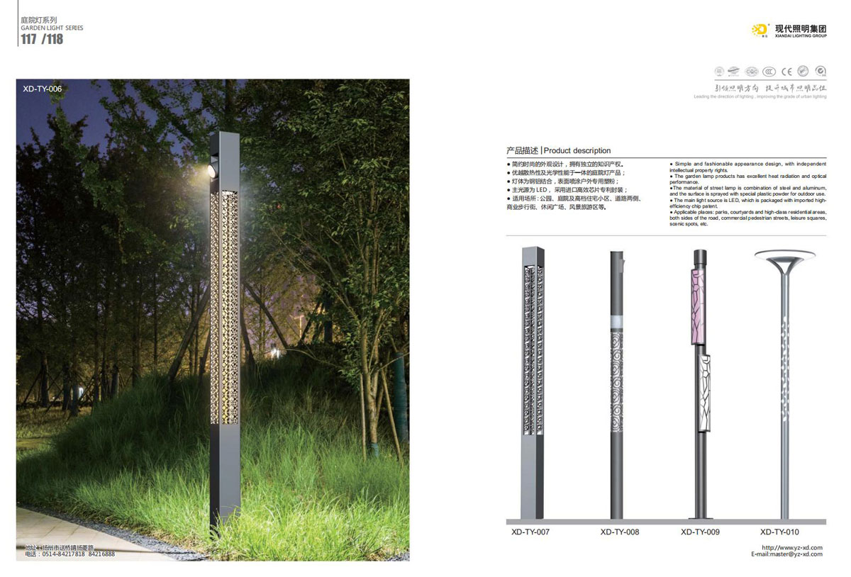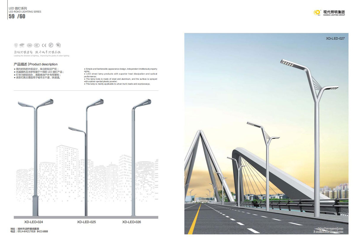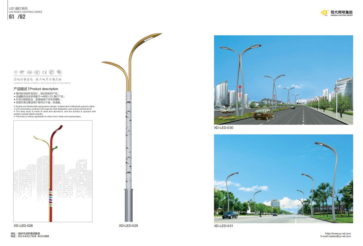 公司集户外照明产品研发、制造、营销、安装于一体,产品涉及道路照明灯具、灯杆、中高杆灯、景观灯、庭院灯、草坪灯、LED新光源、太阳能光伏组件、太阳能路灯、景观亮化、电力杆、通信塔等多个系列近千品种。公司连续多年被工商行政管理局评为“重合同、守信用企业”、连年被江苏省国际咨询评估公司评为“AAA”级资信企业、率先通过了ISO9001:2008国际质量体系认证,ISO:14001/18000国际环境体系认证,太阳能路灯产品获金太阳产品认证,并通过SGS、RASO、CE认证。获江苏省名牌产品、江苏省著名商标、江苏省可再生能源协会副理事单位、扬州路灯商会副理事单位。