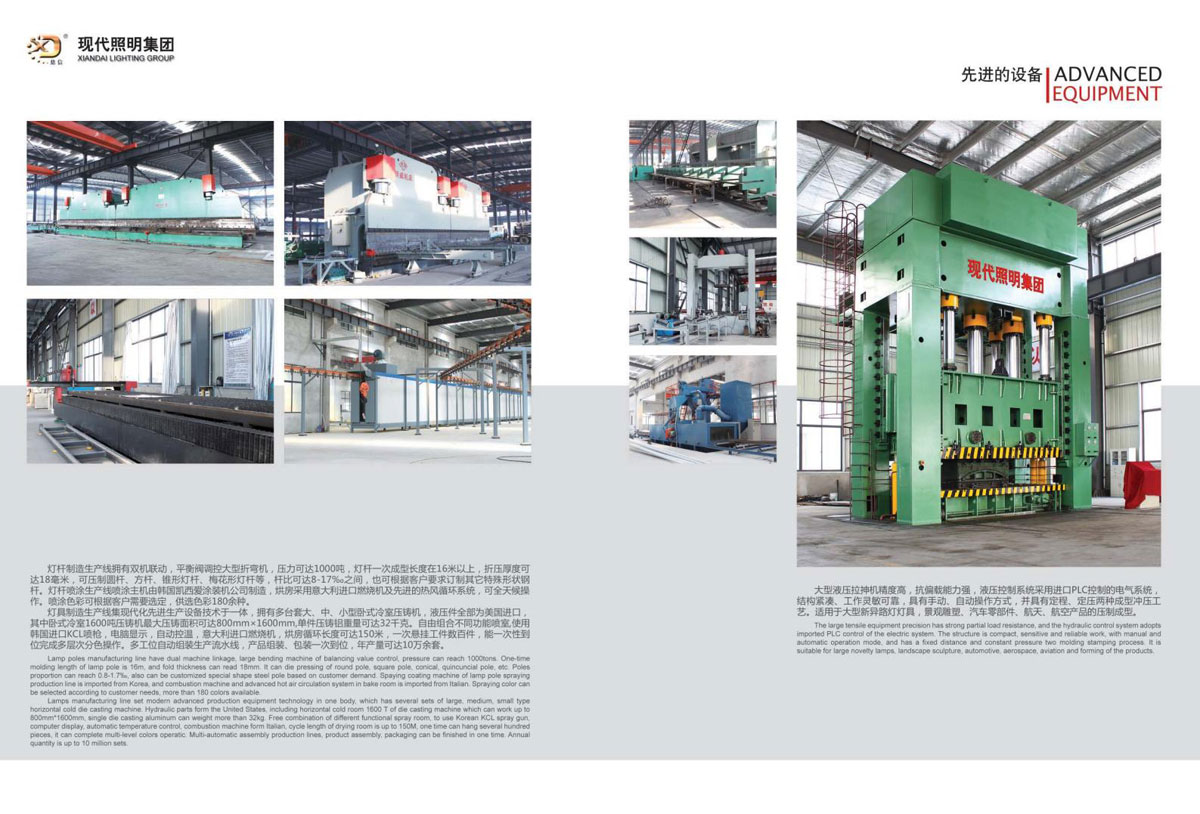 公司长期以来注重科技投入和技术创新,先后与台湾佰鸿公司、中奇(香港)投资集团股份有限公司、中科恒源科技股份有限公司进行技术合作和强强联手,在业界率先推出了一系列具有自主知识产权的高品质绿色节能产品,实现年生产量达数十万盏灯具及5000组电力通信杆的生产能力,为国家重点亮化工程及电力通信提供配套设施和服务,并成功出口东南亚及欧美市场。同时不断引进的大型智能激光机、数控火焰切割机、数控机床、3600吨数控折边机、大型多台套压铸机、层压机、日本产机器人、自动喷涂流水线、光伏组件生产线、LED流水线等多台套高端设备,为产品质量的提升和生产效率的提高插上了腾飞的翅膀,为企业的生存赢得了竞争力,为满足客户的要求提供了有力的保证。