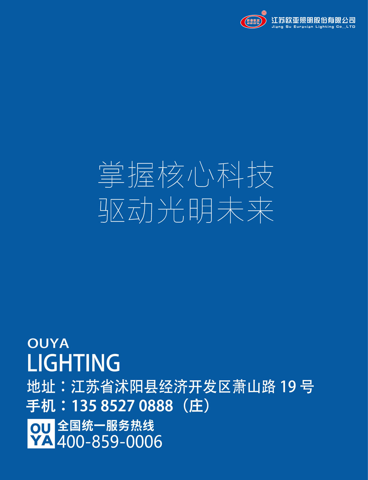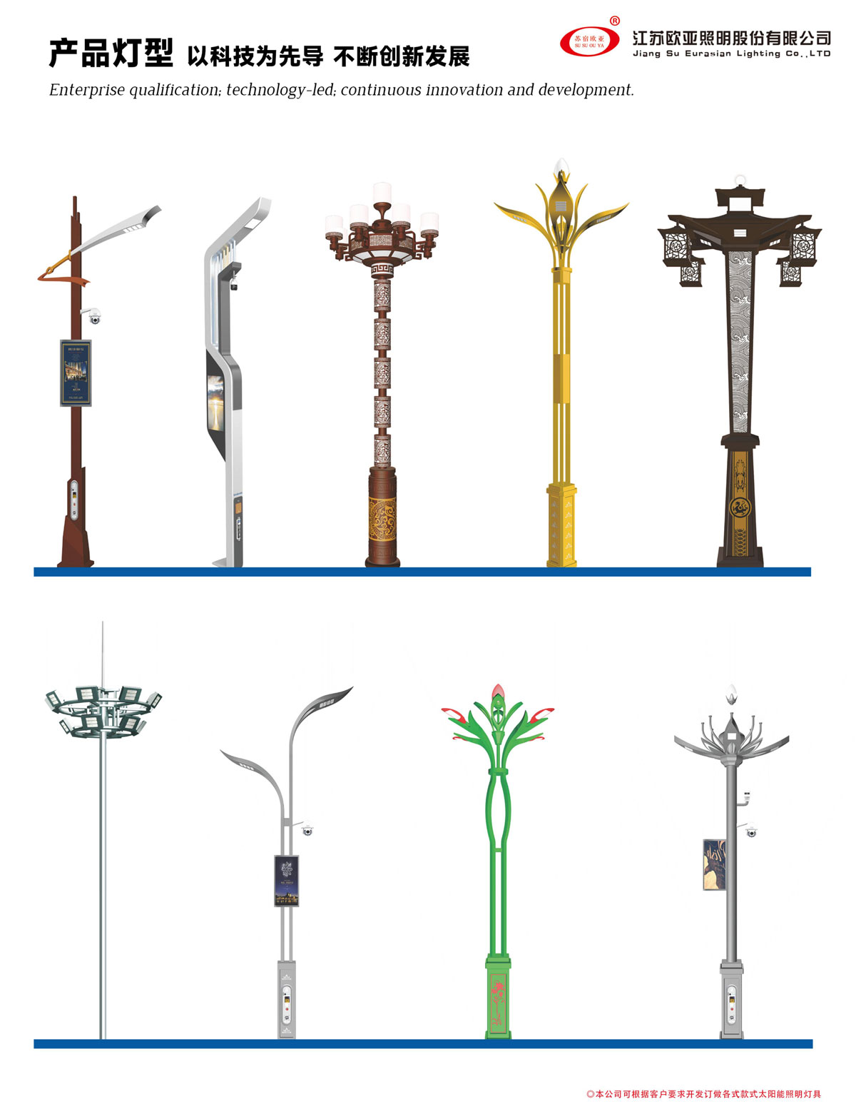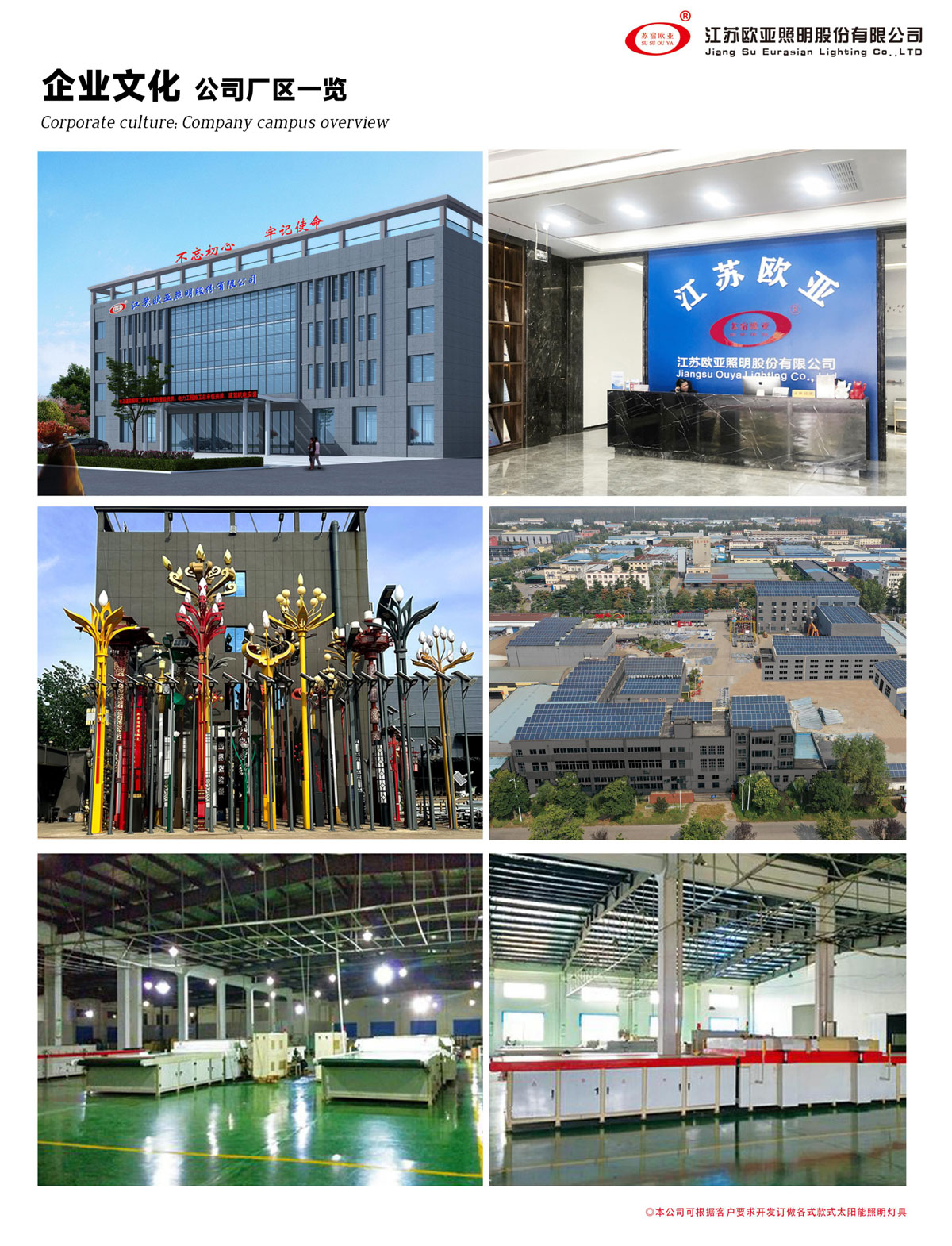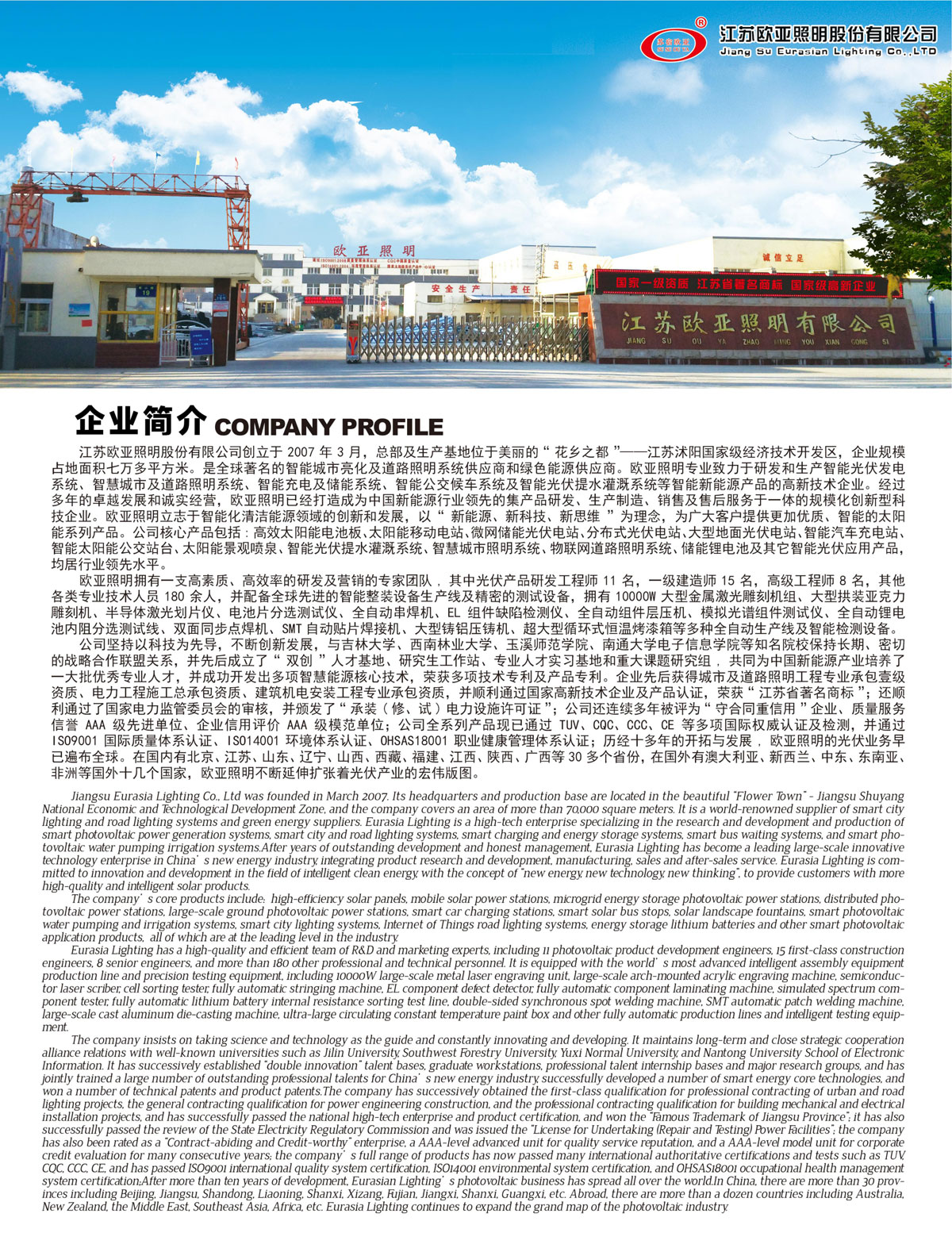 江苏欧亚照明股份有限公司创立于 2007年3月,总部及生产基地位于美丽的“花乡之都”江苏沭阳国家级经济技术开发区,企业规模占地面积七万多平方米。是全球著名的智能城市亮化及道路照明系统供应商和绿色能源供应商。欧亚照明专业致力于研发和生产智能光伏发电系统、智慧城市及道路照明系统、智能充电及储能系统、智能公交候车系统及智能光伏提水灌溉系统等智能新能源产品的高新技术企业。经过多年的卓越发展和诚实经营,欧亚照明已经打造成为中国新能源行业领先的集产品研发、生产制造、销售及售后服务于一体的规模化创新型科技企业。欧亚照明立志于智能化清洁能源领域的创新和发展,以“ 新能源、新科技、新思维”为理念,为广大客户提供更加优质、智能的太阳能系列产品。公司核心产品包括:高效太阳能电池板、太阳能移动电站、微网储能光伏电站、分布式光伏电站、大型地面光伏电站、智能汽车充电站。智能太阳能公交站台、太阳能景观喷泉、智能光伏提水灌溉系统、智慧城市照明系统、物联网道路照明系统、储能锂电池及其它智能光伏应用产品。均居行业领先水平。
