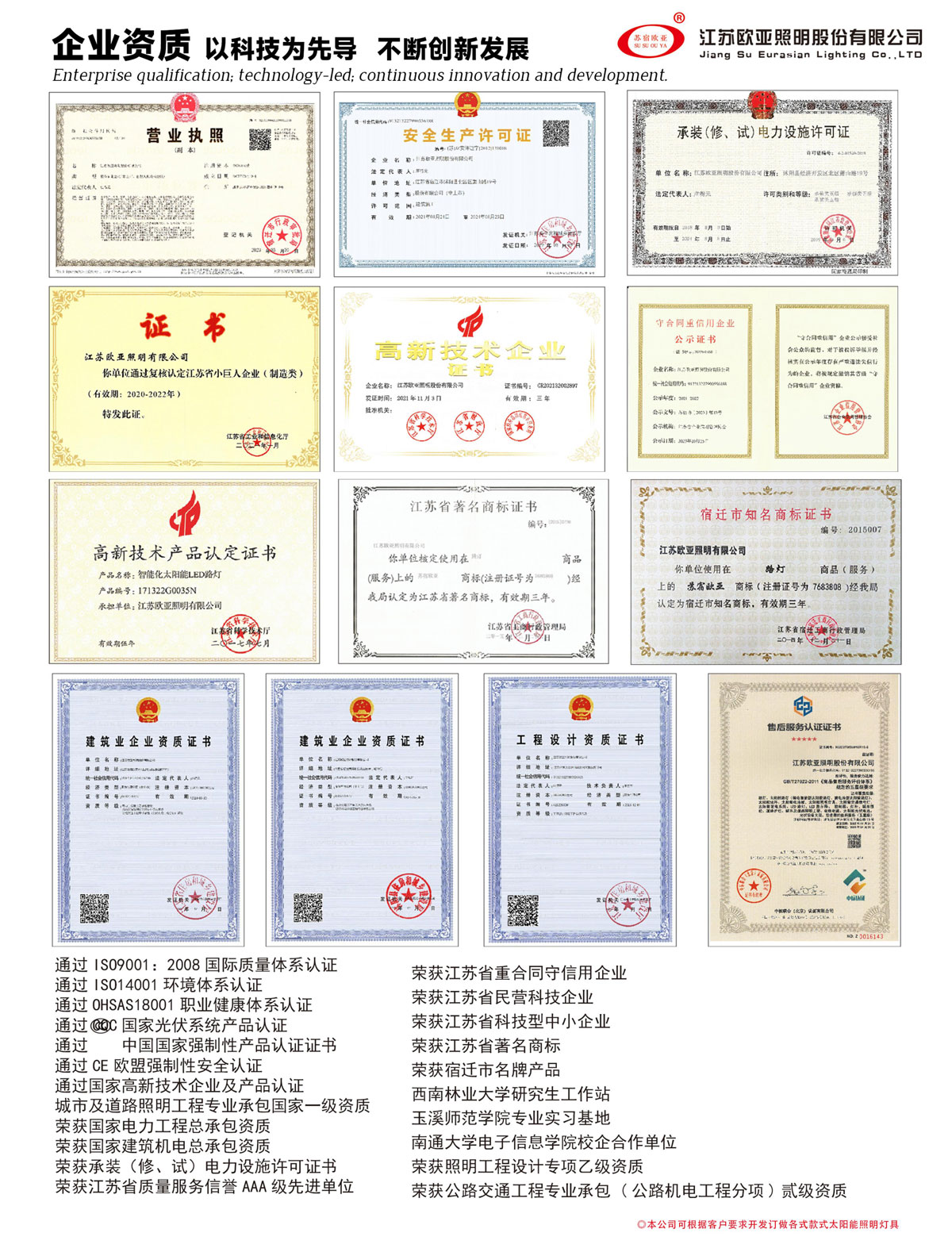 公司坚持以科技为先导,不断创新发展,与吉林大学、西南林业大学、玉溪师范学院、南通大学电子信息学院等知名院校保持长期、密切的战略合作联盟关系,并先后成立了“双创 ”人才基地、研究生工作站、专业人才实习基地和重大课题研究组 ,共同为中国新能源产业培养了一大批优委专业人才,并成功开发出多项智慧能源核心技术,荣获多项技术专利及产品专利。企业先后获得城市及道路照明工程专业承包壹级资质、电力工程施工总承包资质、建筑机电安装工程专业承包资质,并顺利通过国家高新技术企业及产品认证,荣获“江苏省著名商标”;还顺利通过了国家电力监管委员会的审核,并颁发了“承装(修、试)电力设施许可证”;公司还连续多年被评为“守合同重信用”企业、质量服务信誉 AAA 级先进单位、企业信用评价 AAA级模范单位;公司全系列产品现已通过TUV、CQC、CCC、CE等多项国际权威认证及检测,并通过1S09001国际质量体系认证、1S014001环境体系认证、0HSAS18001职业健康管理体系认证;历经十多年的开拓与发展,欧亚照明的光伏业务早已遍布全球。在国内有北京、江苏、山东、辽宁、山西、西藏、福建、江西、陕西、广西等 30 多个省份,在国外有澳大利亚、新西兰、中东、东南亚、非洲等国外十几个国家,欧亚照明不断延伸扩张着光伏产业的宏伟版图。