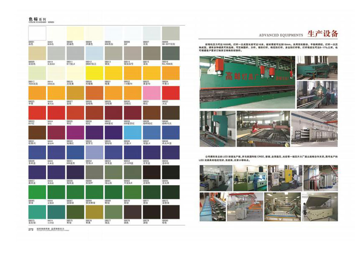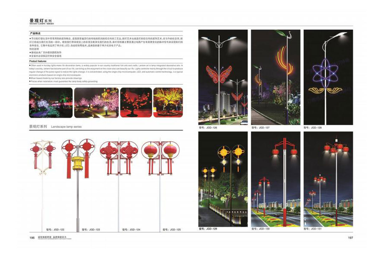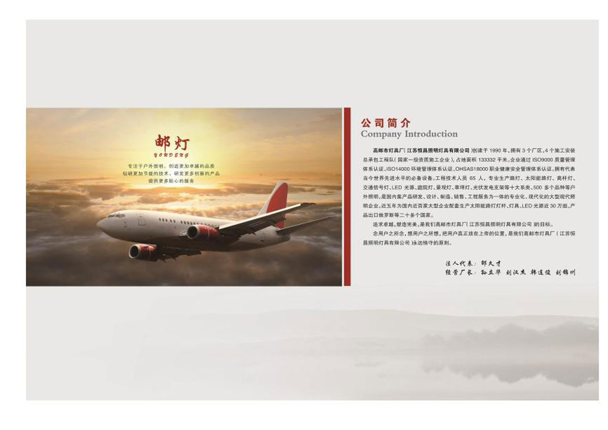 高邮市灯具厂创建于1990年,拥有3个厂区,2个施工安装总承包工程队(城市及道路照明专业承包一级资质、市政公用工程施工总承包三级资质、电子与智能化工程专业承包二级资质、照明工程设计专项乙级资质),占地面积133332m2。拥有代表当今世界先进水平的必备设备和工程技术人员65人,专业生产路灯、太阳能路灯、高杆灯、交通信号灯、LED光源、庭院灯、景观灯、草坪灯、智慧城市、智慧照明、楼宇桥梁河道广场景观亮化和能源管理等十大系类、1000多个品种等户外照明。是国内集产品研发、设计、制造、销售、工程服务为一体的专业化、规模化、现代化的大型现代照明企业。近五年为国内近百家大型企业配套生产路灯、太阳能路灯灯杆、灯具、LED光源三十多万台,产品出口俄罗斯等五十多个国家。