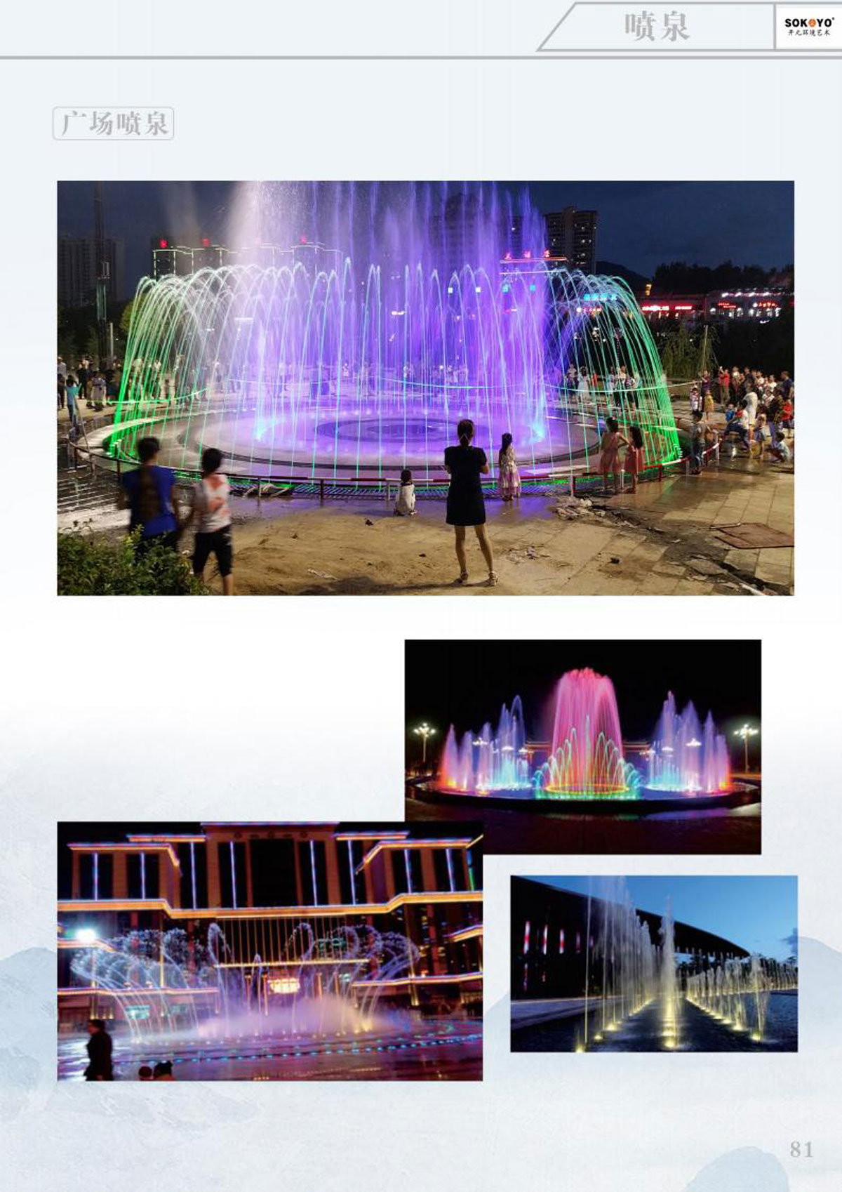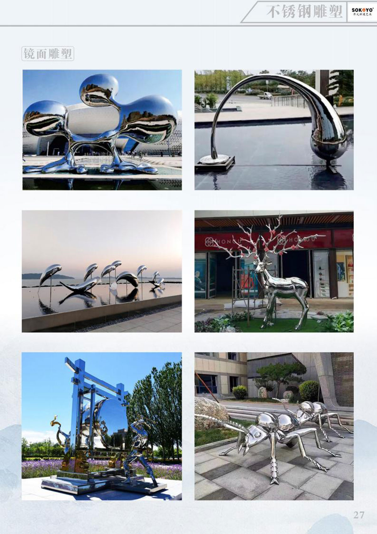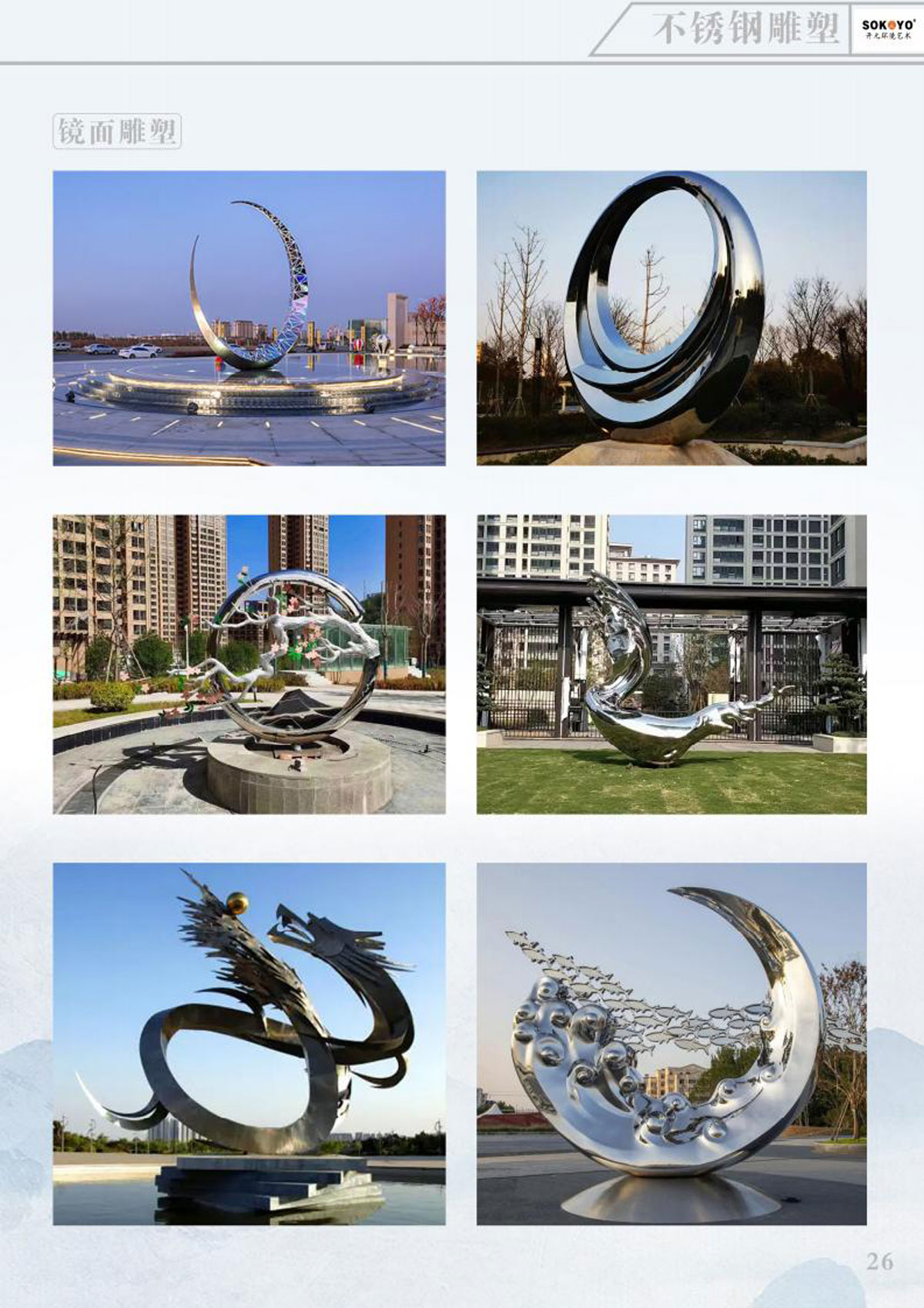 本公司主要产品有:不锈钢雕塑、玻璃钢雕塑、铸锻铜雕塑、发光雕塑、节日彩灯、稻草雕塑;音乐喷泉、旱式泉、程控喷泉、室内喷泉、冷雾喷泉、光亮跳泉、激光水器电影,公司秉承“科技创新、人文经典、艺术永恒”的理念,博众家之长,集古今之蕴,既有现代风格,亦有古典风韵,成为国内水景界的新星。