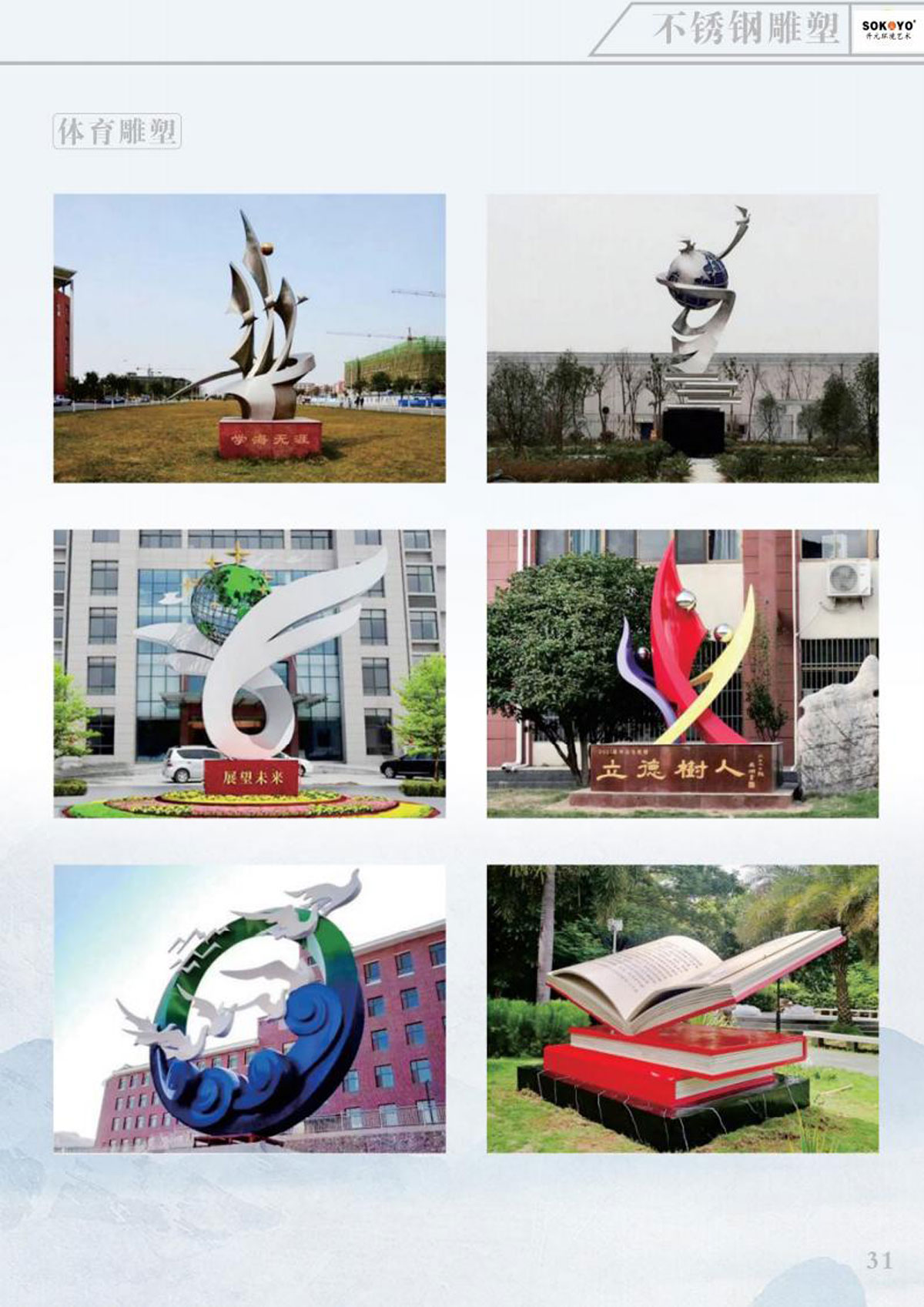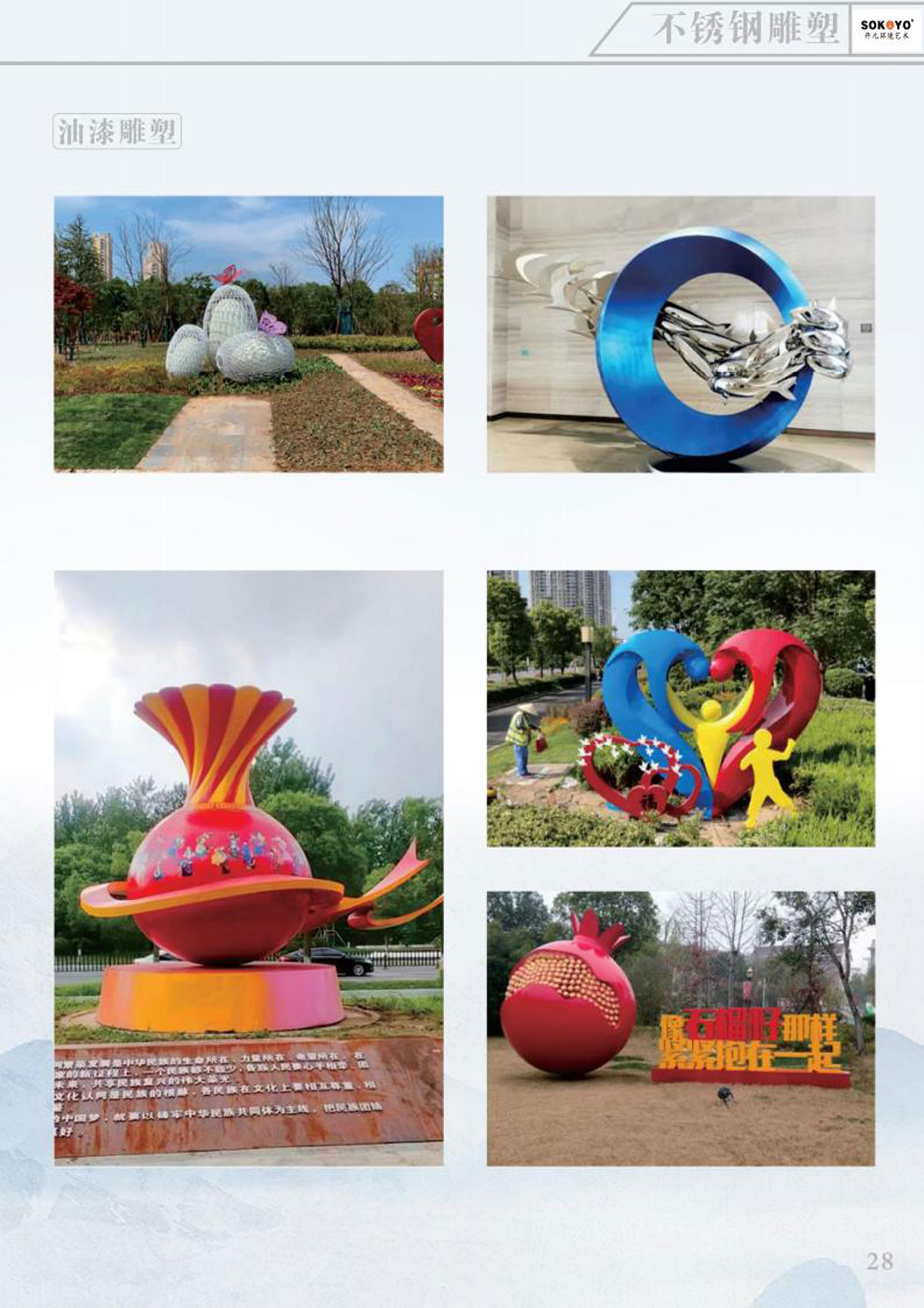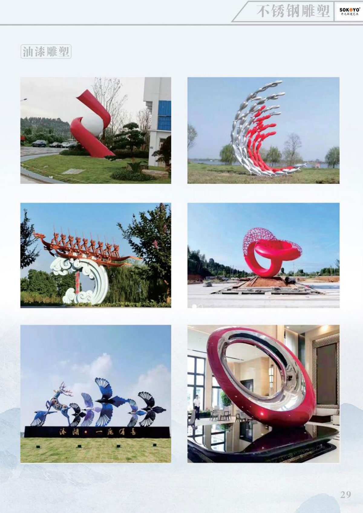 本公司主要产品有:不锈钢雕塑、玻璃钢雕塑、铸锻铜雕塑、发光雕塑、节日彩灯、稻草雕塑;音乐喷泉、旱式泉、程控喷泉、室内喷泉、冷雾喷泉、光亮跳泉、激光水器电影,公司秉承“科技创新、人文经典、艺术永恒”的理念,博众家之长,集古今之蕴,既有现代风格,亦有古典风韵,成为国内水景界的新星。