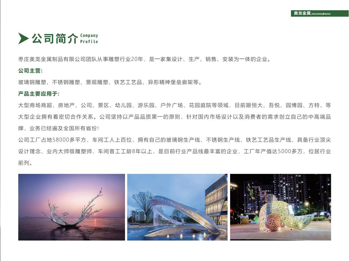 枣庄奥龙金属制品有限公司团队从事雕塑行业20年,是一家集设计、生产、销售、安装为一体的企业。