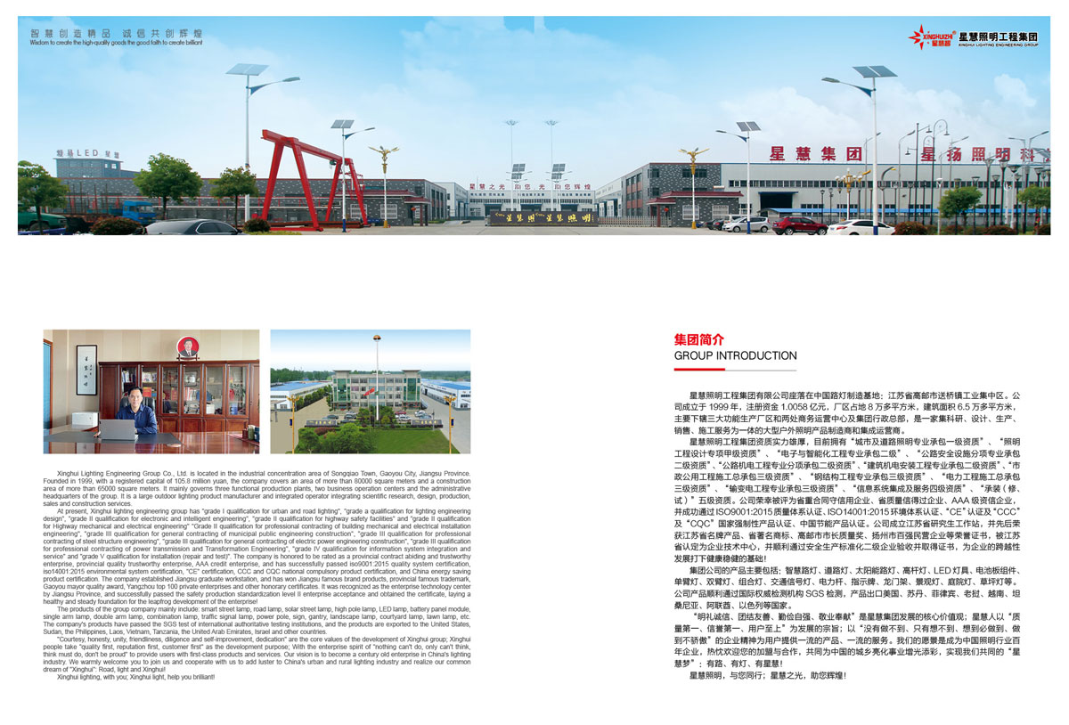 星慧照明工程集团有限公司座落在中国路灯制造基地:江苏省高邮市送桥镇工业集中区。公司成立于1999年,注册资金1.0058亿元,厂区占地8万多平方米,建筑面积6.5万多平方米,主要下辖三大功能生产厂区和两处商务运营中心及集团行政总部,是一家集科研、设计、生产、销售、施工服务为一体的大型户外照明产品制造商和集成运营商。