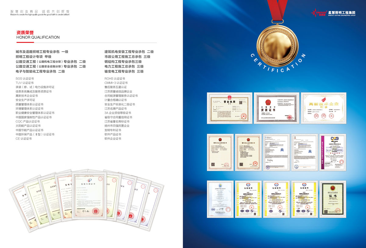 星慧照明工程集团资质实力雄厚,目前拥有“城市及道路照明专业承包一级资质”、“照明工程设计专项甲级资质”、“电子与智能化工程专业承包二级”、“公路安全设施分项专业承包二级资质”、“公路机电工程专业分项承包二级资质”、“建筑机电安装工程专业承包二级资质”、“市政公用工程施工总承包三级资质”、“钢结构工程专业承包三级资质”、“电力工程施工总承包三级资质”、“输变电工程专业承包三级资质”、“信息系统集成及服务四级资质”、“承装(修、试)”五级资质。公司荣幸被评为省重合同守信用企业、省质量信得过企业、AAA级资信企业,并成功通过ISO9001:2015质量体系认证、ISO14001:2015环境体系认证、“CE”认证及“CCC”及“CQC”国家强制性产品认证、中国节能产品认证。公司成立江苏省研究生工作站,并先后荣获江苏省名牌产品、省著名商标、高邮市市长质量奖、扬州市百强民营企业等荣誉证书,被江苏省认定为企业技术中心,并顺利通过安全生产标准化二级企业验收并取得证书,为企业的跨越性发展打下健康稳健的基础!