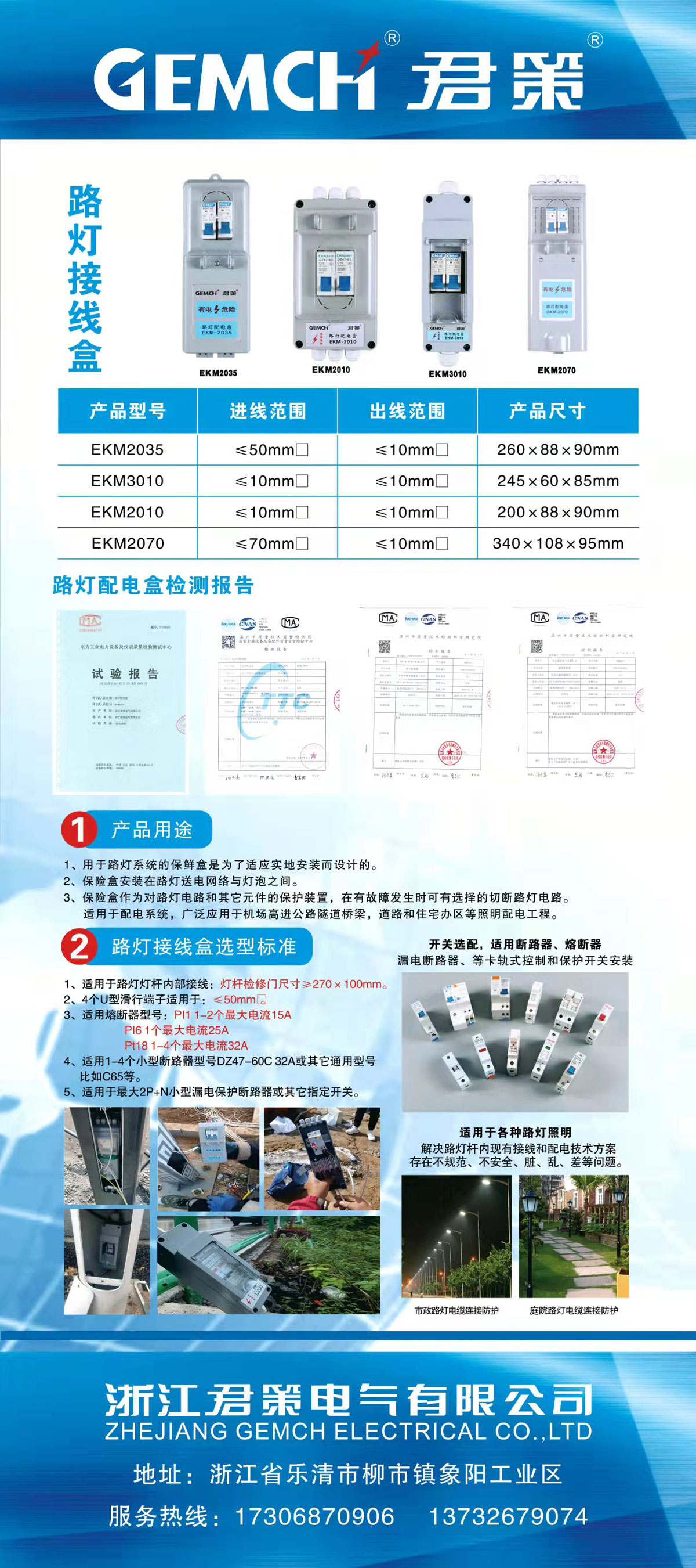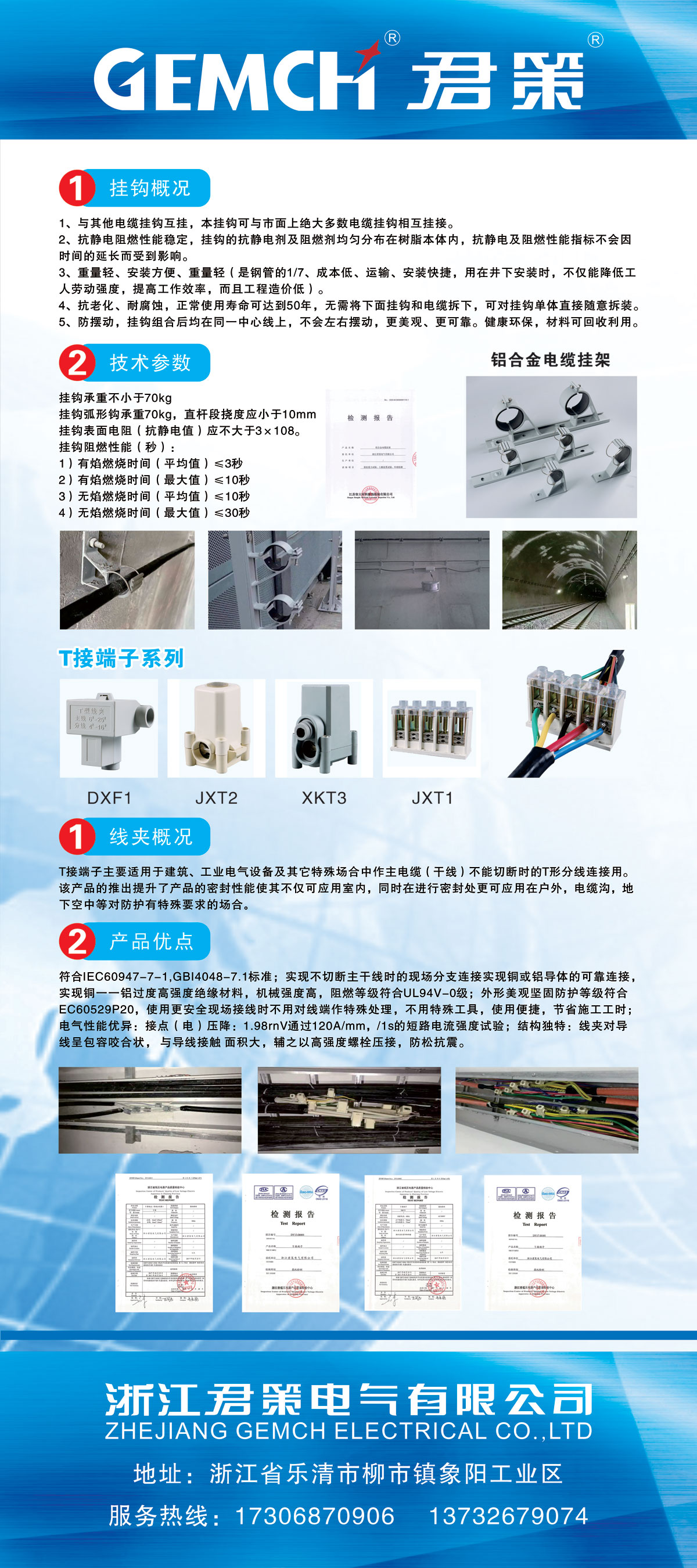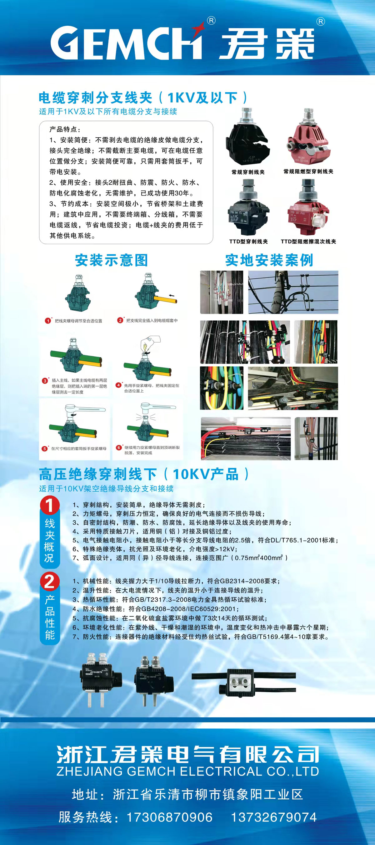 江西君策电气有限公司暨浙江君策电气有限公司,位于誉称“中国电器之都”的乐清市柳市镇,紧靠“甬-台-温”高速公路,距温州机场35公里。公司现有大中小型注塑机共6台,冲床,铣床,钻台等设备齐全,可自主开发模具,加工生产。公司员工共上百余人,其中,高级工程师职称员工3名,大专以上学历9名,现主营:灌胶防水接线盒、路灯配电盒EKM2035、安普型穿刺线夹、西卡姆型穿刺线夹、隧道专用电缆分线盒、高压穿刺线夹/接地线夹等多种产品。