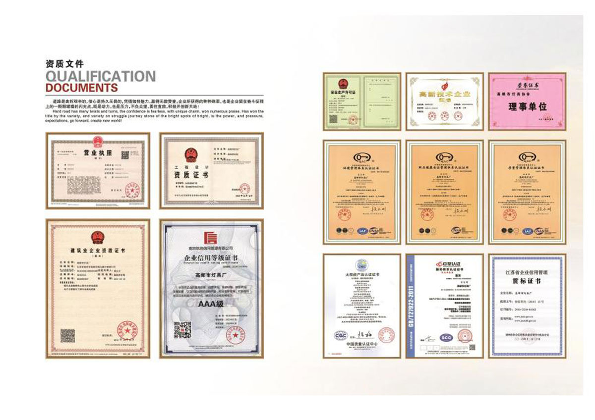 高邮市灯具厂创建于1990年,拥有3个厂区,2个施工安装总承包工程队(城市及道路照明专业承包一级资质、市政公用工程施工总承包三级资质、电子与智能化工程专业承包二级资质、照明工程设计专项乙级资质),占地面积133332m2。拥有代表当今世界先进水平的必备设备和工程技术人员65人,专业生产路灯、太阳能路灯、高杆灯、交通信号灯、LED光源、庭院灯、景观灯、草坪灯、智慧城市、智慧照明、楼宇桥梁河道广场景观亮化和能源管理等十大系类、1000多个品种等户外照明。是国内集产品研发、设计、制造、销售、工程服务为一体的专业化、规模化、现代化的大型现代照明企业。近五年为国内近百家大型企业配套生产路灯、太阳能路灯灯杆、灯具、LED光源三十多万台,产品出口俄罗斯等五十多个国家。