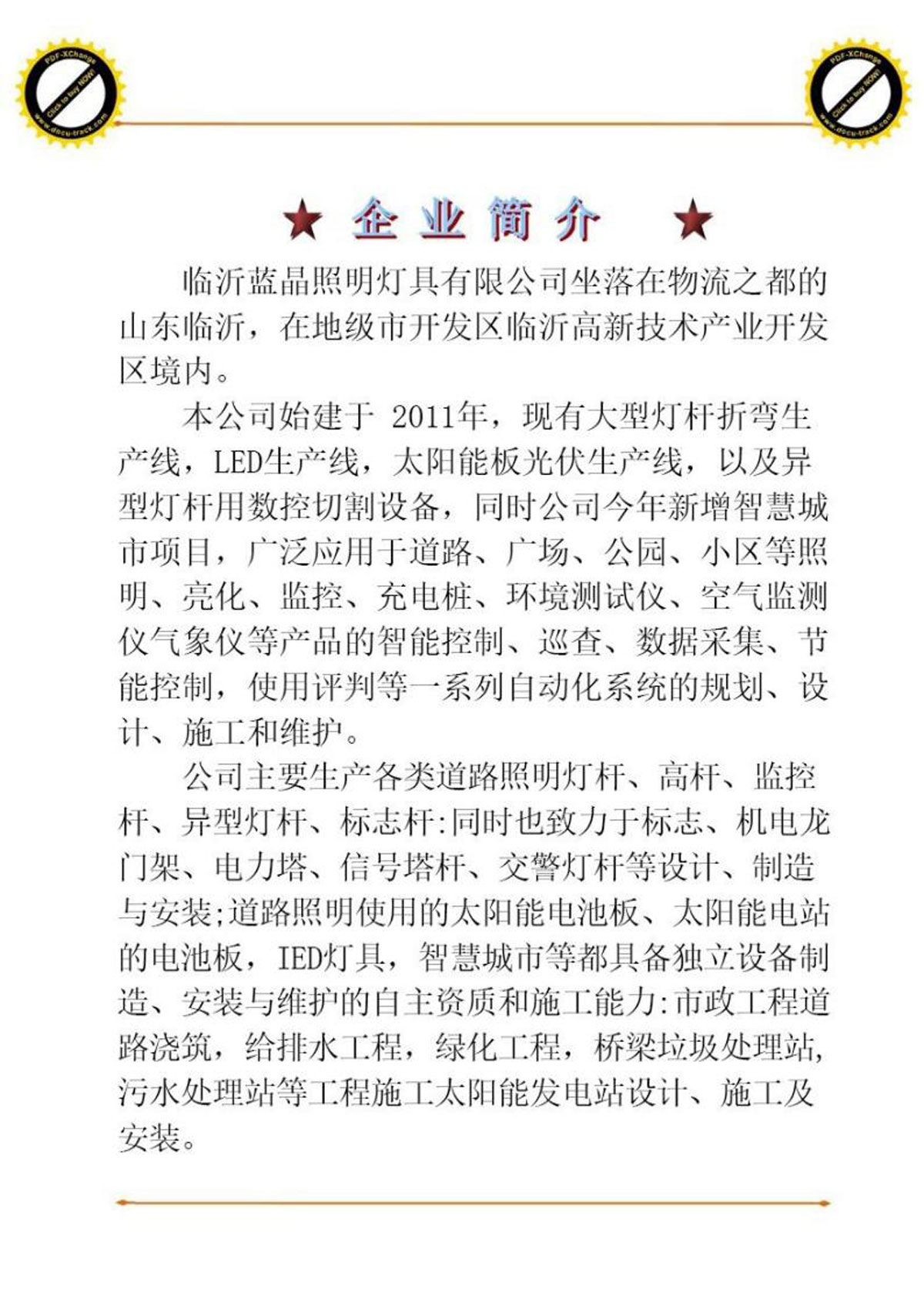 本公司始建于2011年,现有大型灯杆折弯生产线,LED生产线,太阳能板光伏生产线,以及异型灯杆用数控切割设备,同时公司今年新增智慧城市项目,广泛应用于道路、广场、公园、小区等照明、亮化、监控、充电桩、环境测试仪、空气监测仪气象仪等产品的智能控制、巡查、数据采集、节能控制,使用评判等一系列自动化系统的规划、设计、施工和维护。