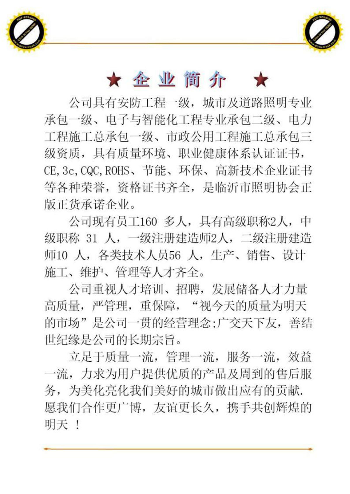 公司具有安防工程一级,城市及道路照明专业承包一级、电子与智能化工程专业承包二级、电力工程施工总承包一级、市政公用工程施工总承包三级资质,具有质量环境、职业健康体系认证证书,CE,3c,CQC,ROHS、节能、环保、高新技术企业证书等各种荣誉,资格证书齐全,是临沂市照明协会正版正货承诺企业。
