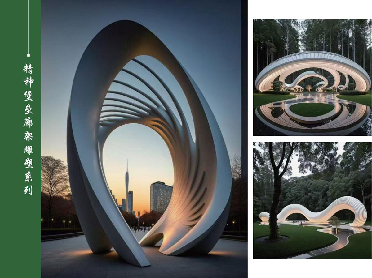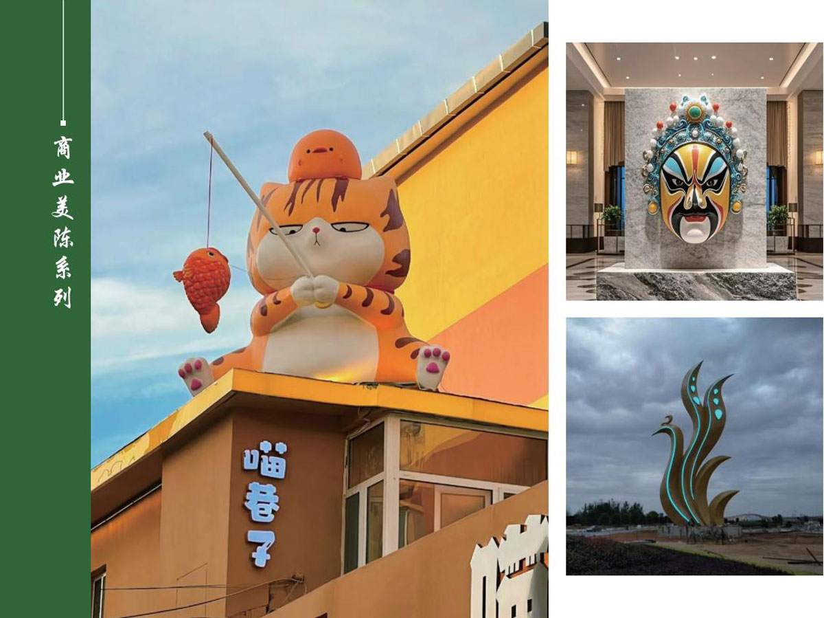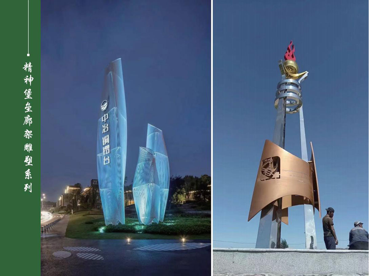 玻璃钢雕塑、不锈钢雕塑、景观雕塑、铁艺工艺品、异形精神堡垒廊架等。