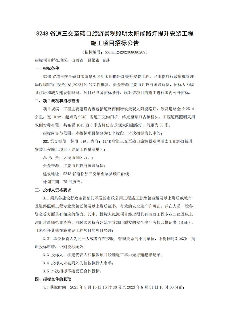 S248省道三交至碛口旅游景观照明太阳能路灯提升安装工程施工项目招标公告